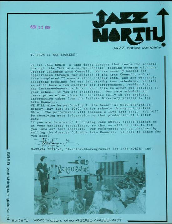 This flyer promoted the Jazz North Jazz Dance Company's involvement in the "Artists-in-the-Schools" program sponsored by the Greater Columbus Arts Council. The program brought performing artists like Barbara Burrows, Director of the Worthington Civic Ballet and Jazz North Dance Company into grade schools throughout central Ohio. The program provided students with a taste of dance education that they would normally not have had exposure to in the schools' physical education curriculum.