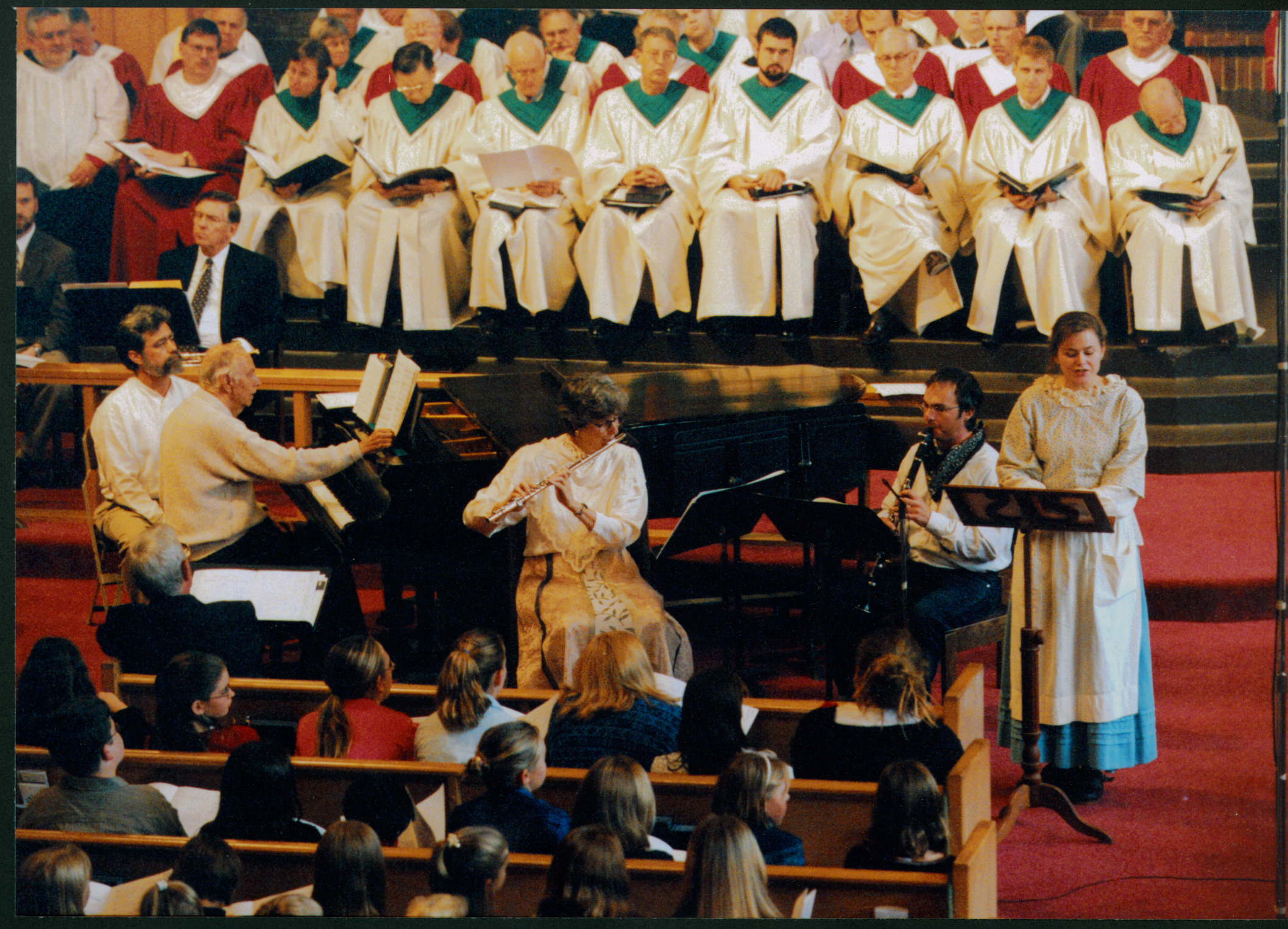 The Old Worthington Suite, written in 1964 by Marshall N. Barnes, Worthington composer was one of the songs performed during the Founders Day Service of Thanksgiving in 2002 at Worthington United Methodist Church. Pictured left to right are; Howard Davis (whistler), Marshall Barnes (piano), Katherine Borst-Jones (flute), Tim Santos (flute), and Christine Strohl Mortine (narrator/singer).