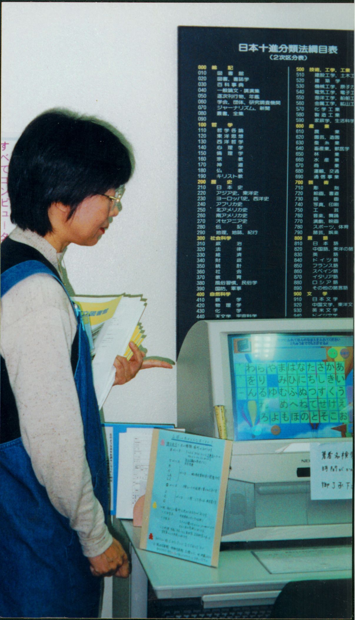 A librarian at Sayama Public Library, the sister library of Worthington Libraries in Sayama, Japan is shown giving a tour to the 1999 WIFA delegates, Robert Chosy, Paul Cynkar, Judy Chosy and Miriam Utter.