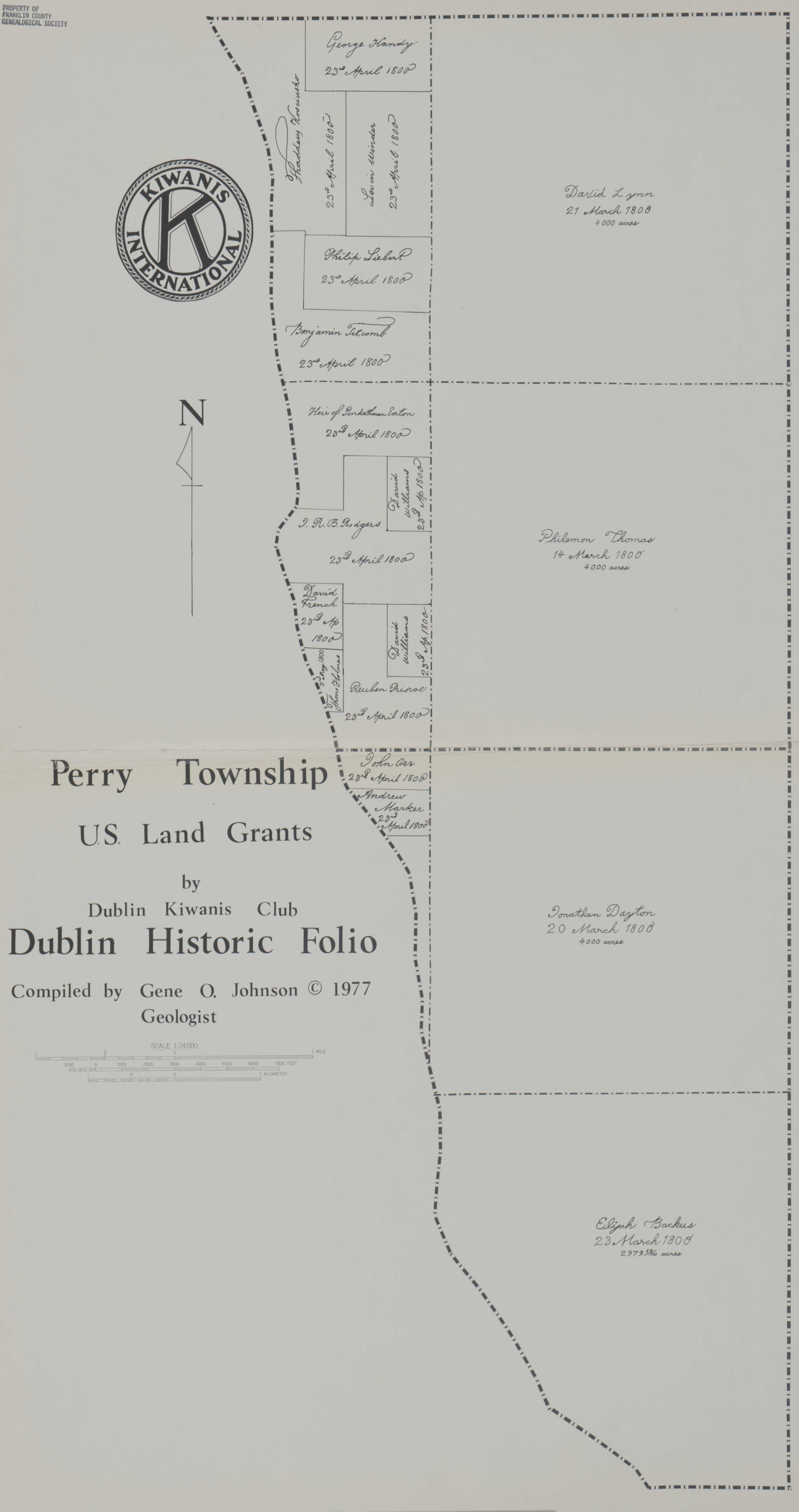 This plat map for Perry Township, Franklin County, Ohio, shows property ownership from the original U.S. land grants in 1800. It's taken from the "Dublin Historic Folio," which was donated to the Columbus Library by The Franklin County Genealogical and Historical Society.