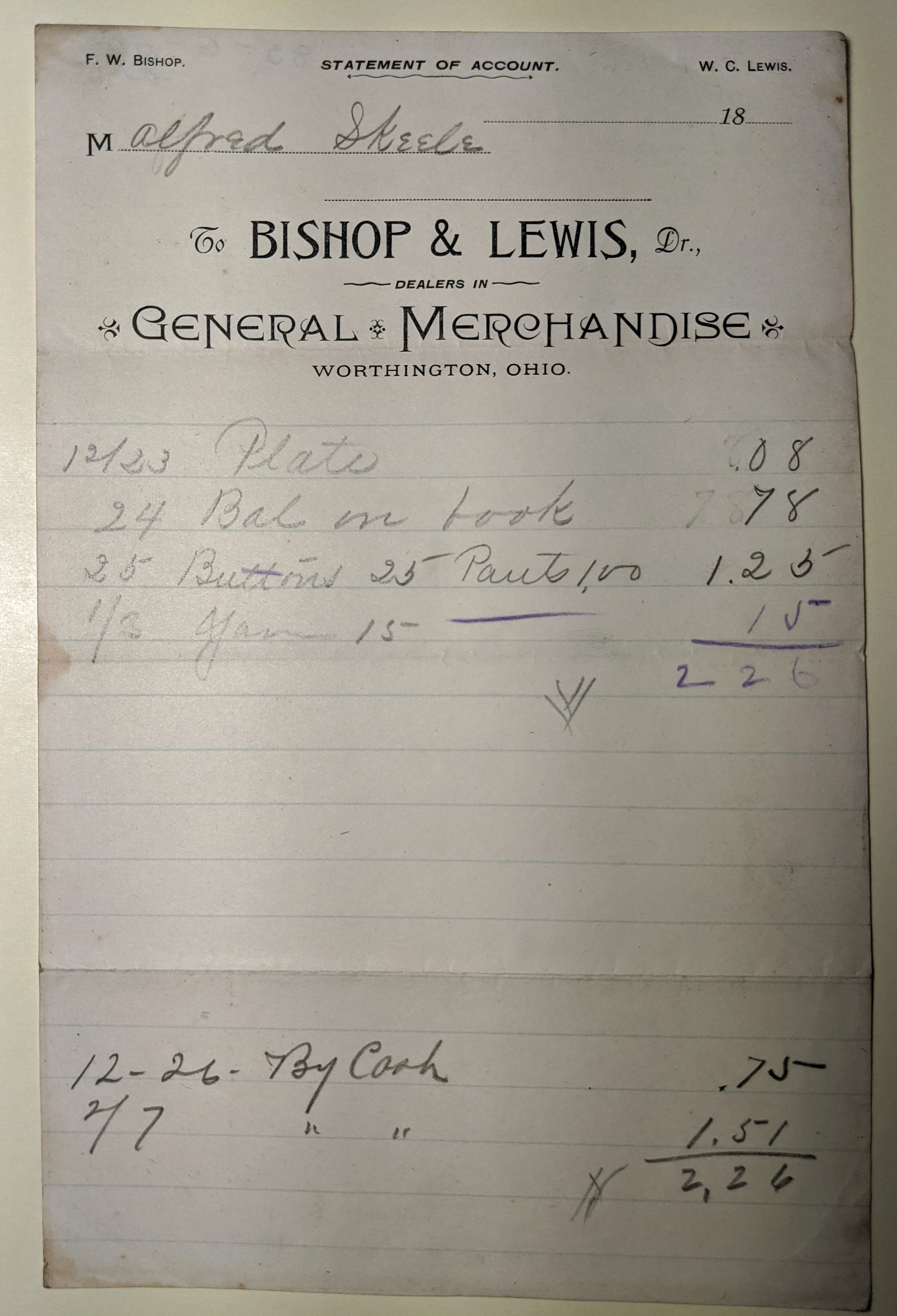 This account statement from Bishop & Lewis, dealers in general merchandise, dates to the late 1800's. Frank Bishop (b. 1854, d. 1913) and Worthington C. Lewis (b. 1859, d. 1950) opened a general store in the mid-1800's. In 1890 the pair moved the store to 659 High Street, which later became Kroger's in the 1920's, the "Nuts and Bolts" section of Worthington Hardware through the end of the 20th century, and now is Co-Hatch and Grid Furnishings. The store sold a wide variety of goods including groceries, clothing and homewares. By 1900, W.C. Lewis took over the operation and renamed the store the Lewis Department Store.