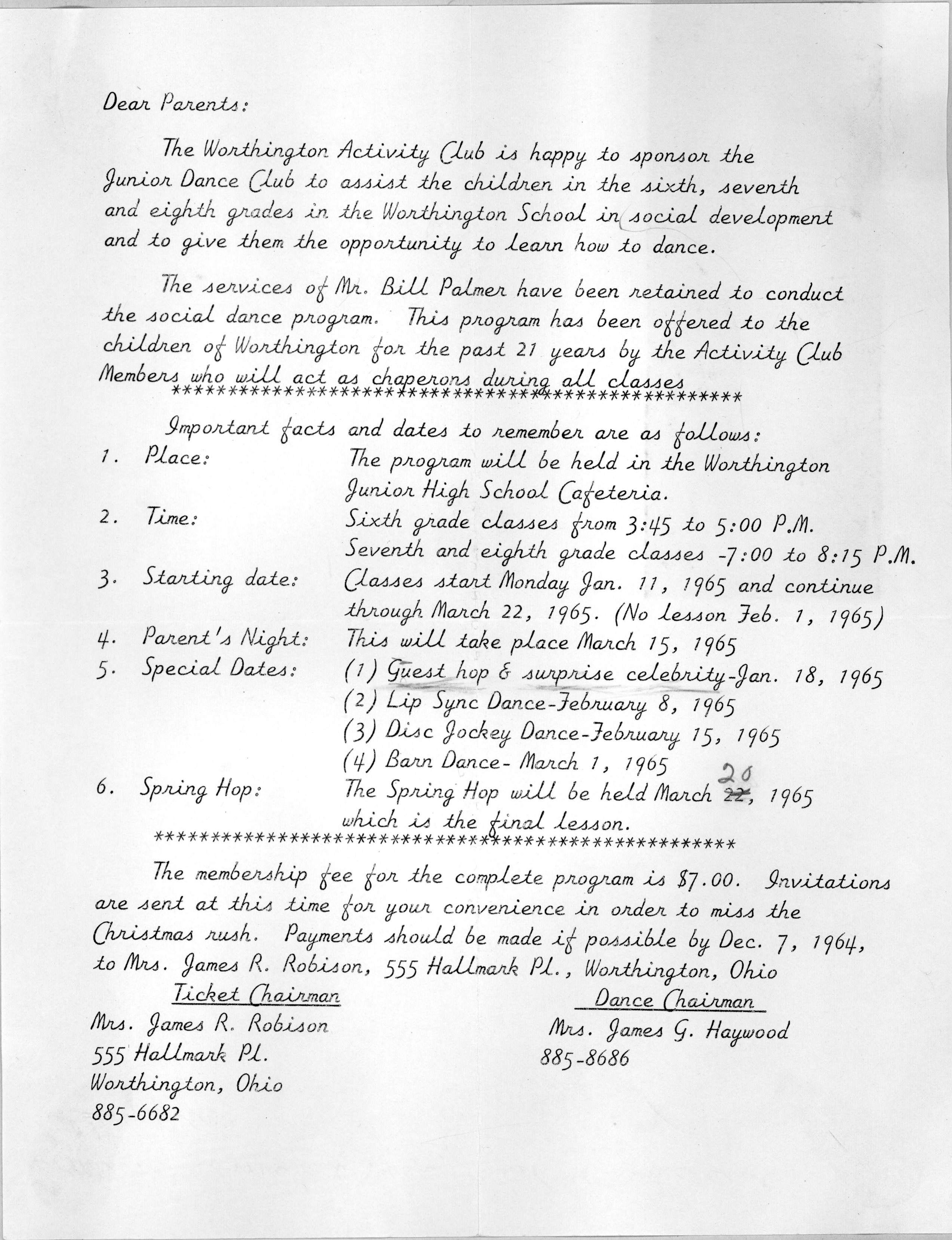 The Activity Club was founded in 1937 as the Personality Club by Mrs. Miriam Mackay, who saw a great need to form an organization dedicated to assisting youth with their social and personal problems. The club was originally formed with sponsorship by the Worthington P.T.A. Among the first activities of the group was the remodeling of formals for girls who were in need of them. Guidance concerning proper dress, manners and hostess etiquette were in demand. Although the club's focus was initially on girls, boys soon became interested and were also included in the programs. Over the years interests broadened, and the group was reorganized as the Activity Club. Social dancing classes for students from grade 4 to 12 became a major activity of the club during the 1940s and 1950s. Interest in dancing declined during the 1960s. Following a brief renewal of interest in dancing in the late 1970s, the emphasis on dance programs was discontinued.