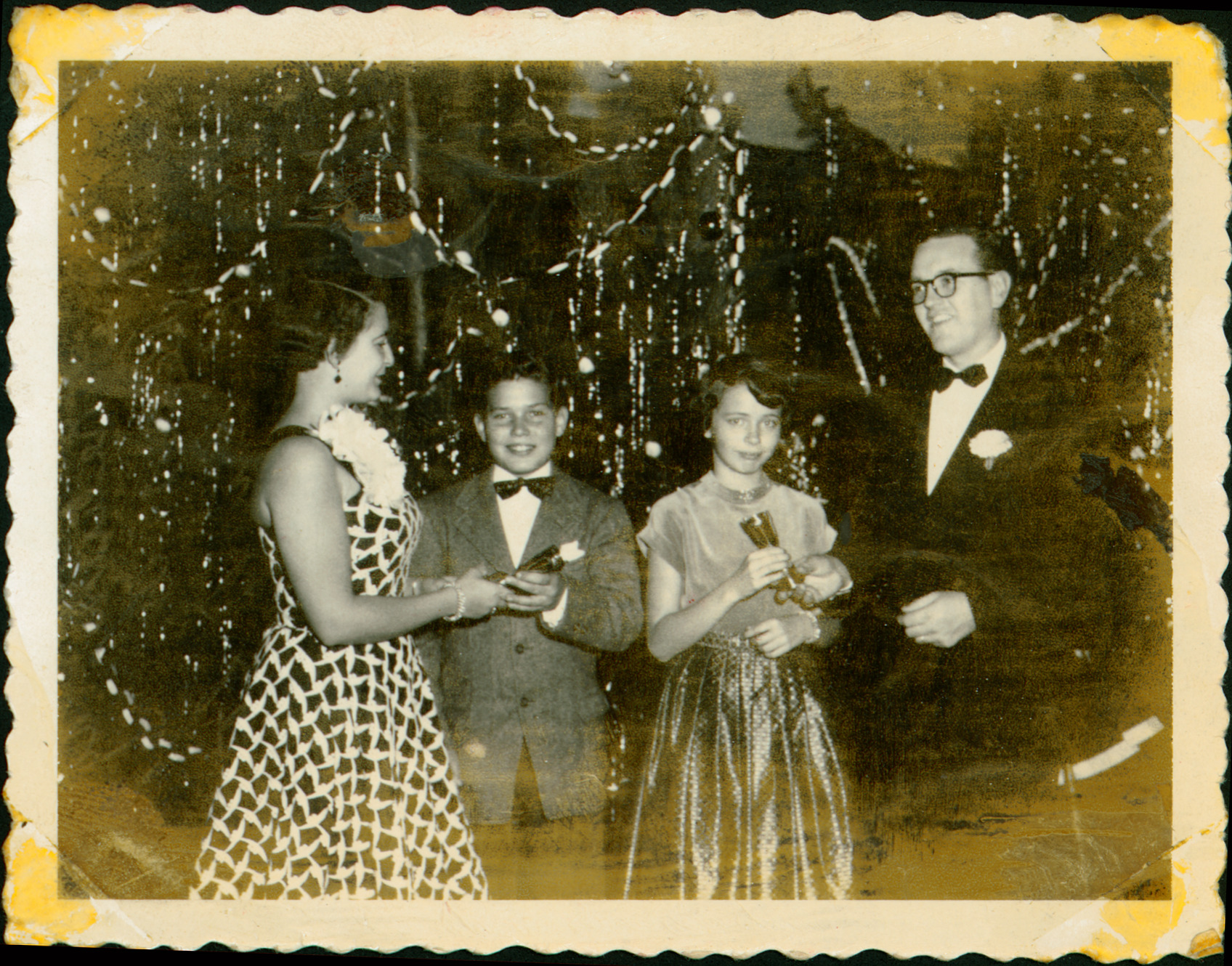 Winners of trophies from the 4th-6th grade ballroom dancing classes sponsored by the Activity Club in 1954 are pictured with the dance instructors. Trophies were awarded to students based on improvement in dancing, cooperation, and good manners. Left to right are Joyce Horn, Gary Wing, Jane Beaver, and Larry Horn. Students participated in a series of 10 dance classes throughout the fall.