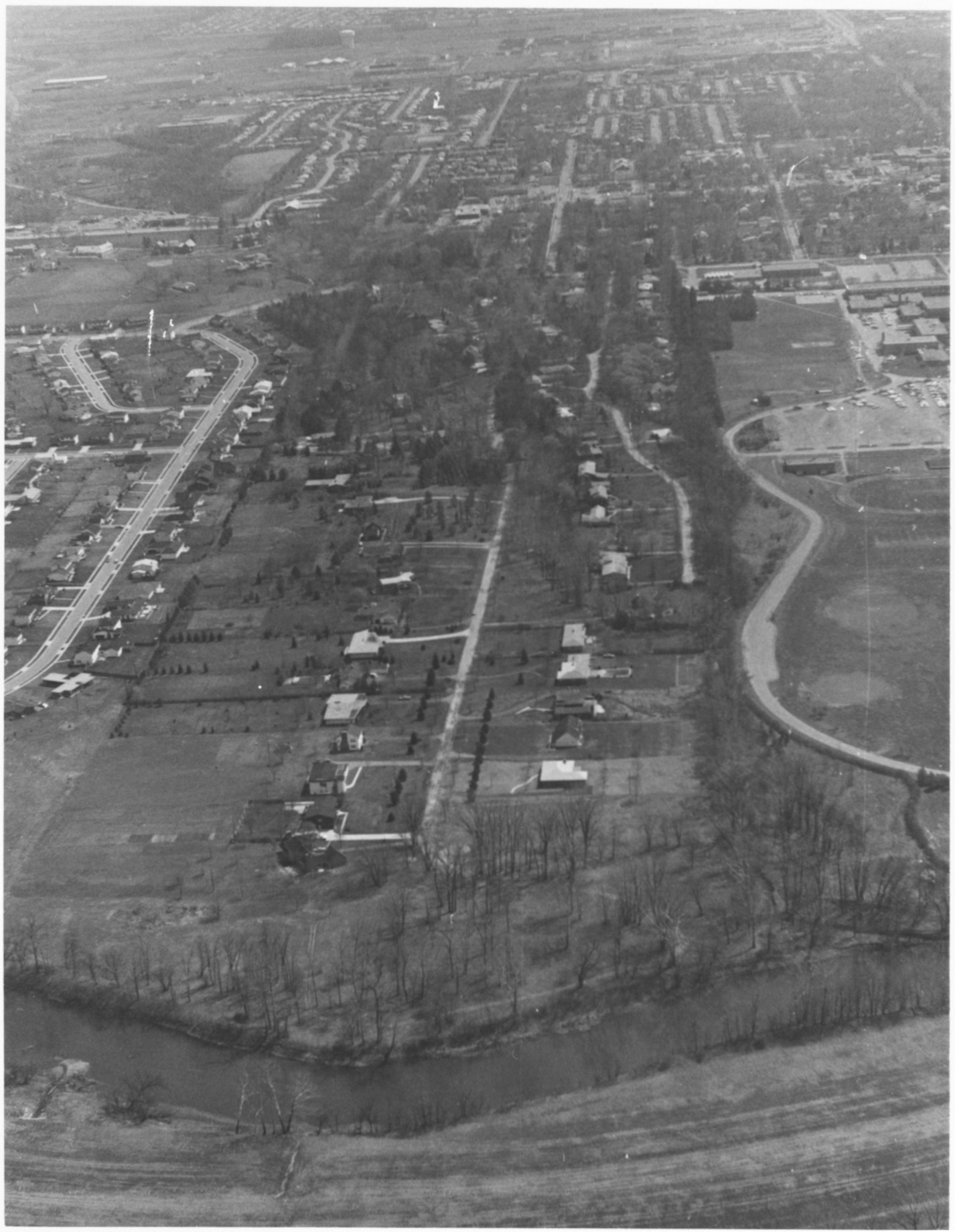 This view from the Olentangy River shows Medick Estates (Tucker Drive and Medick Way looking east). In 1929 Frank Medick began developing the "Clear View" addition in the northwest portion of the Village. He purchased farmland which was developed as Medick Estates and annexed to Worthington in 1951.