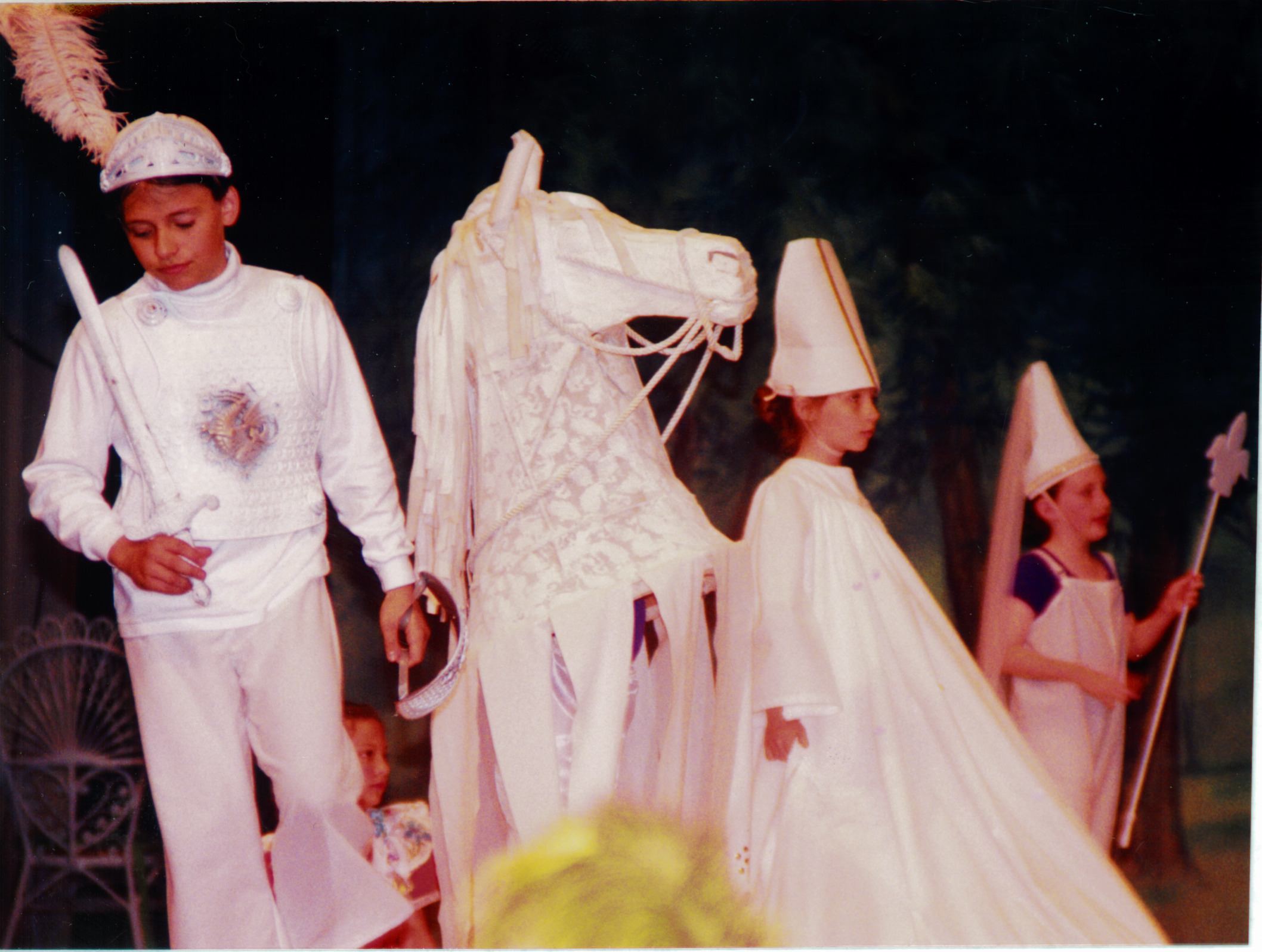 This photograph depicts a scene involving the White Queen's Games from the "Alice though the Looking Glass" ballet, based on Lewis Carroll's classic children's book Alice in Wonderland. The Worthington Civic Ballet and Youtheatre's 1996 production featured elaborate costumes that were designed and hand made by director Barbara Burrows, based on the original Lewis Carroll illustrations.