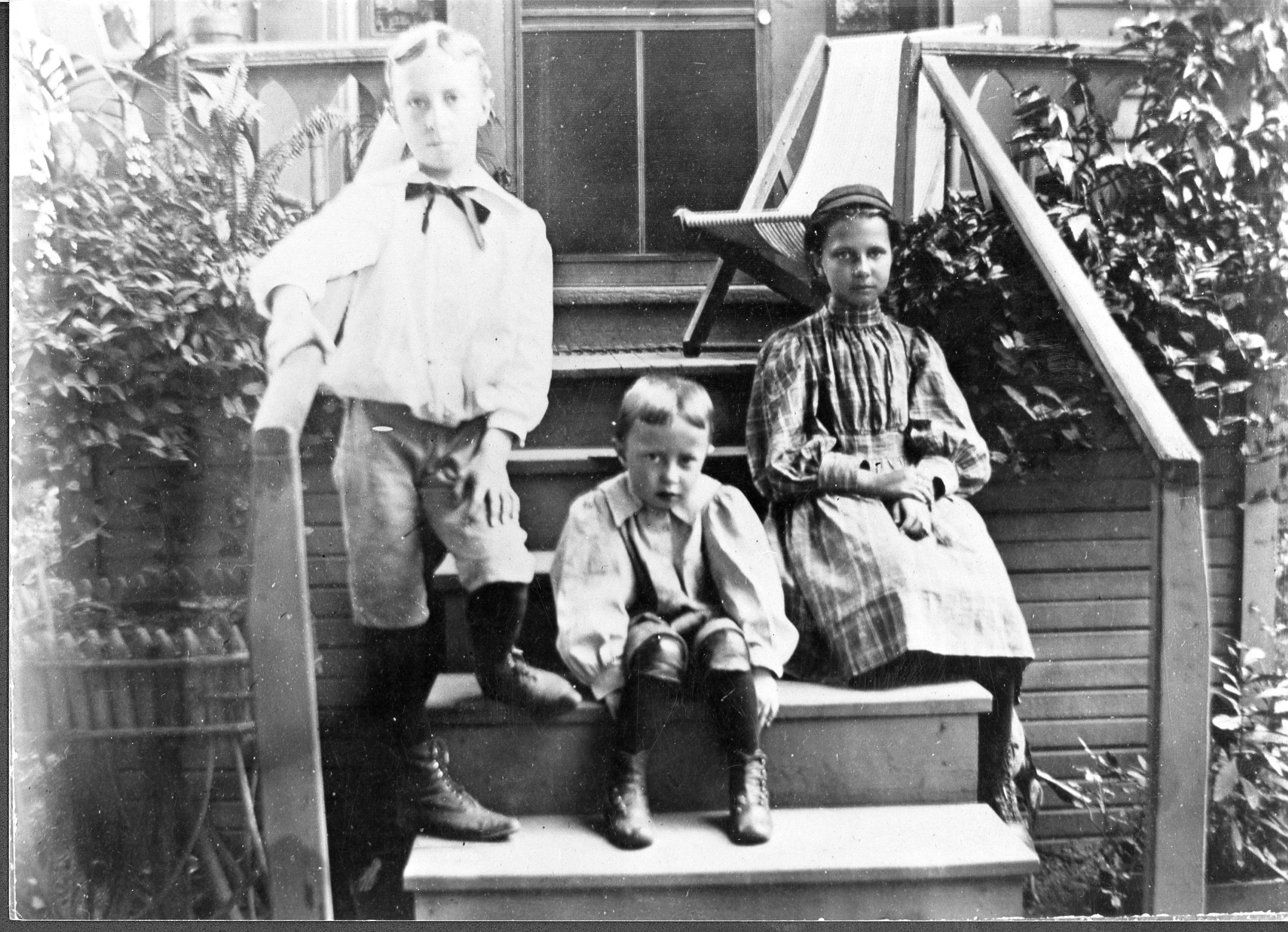 This photograph depicts Norman Badger, Alex Badger and Mary Badger at the Old Episcopal Rectory. Their father Rev. Norman H. Badger served as Rector of St. John's Episcopal Church of Worthington from April 1st, 1892 through July 1902. The Old Episcopal Rectory was located on Worthington's Village Green, adjacent to St. John's Episcopal Church of Worthington at the time of this photograph. The Rectory built in 1845 was the first parsonage for St. John's Episcopal Church and has been moved twice. The first move was to 799 Hartford Street in 1924. The building was sold to the Worthington Historical Society in 1978 and moved to its present location at 50 W. New England Ave. It houses the Worthington Historical Society offices, Doll Museum and Gift Shop.