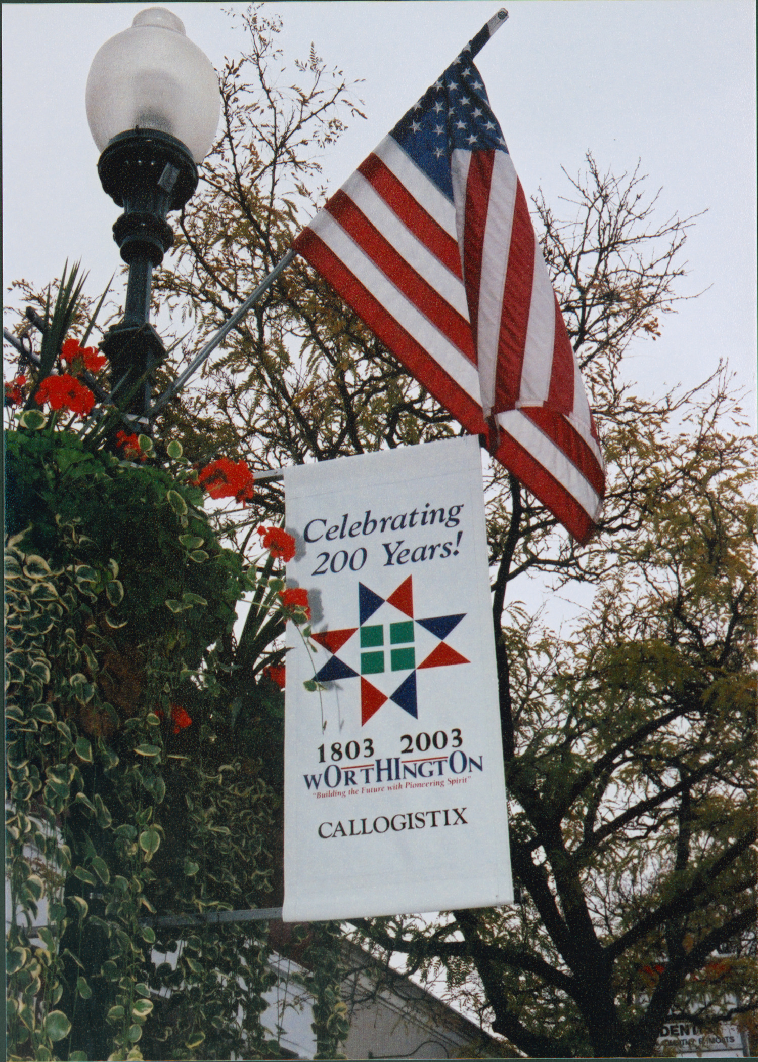 During the City of Worthington's Bicentennial Celebration (October 2002 - October 2003) banners were displayed along High Street and Granville Road in Old Worthington. The banners featured the Worthington Star, the official symbolof the City's Bicentennial. A contest was held in 2000 to solicit designs from Worthington area residents for the Bicentennial logo. The Worthington Star quilting design was selected as the winning entry. It was designed by Worthington area resident Joe McAnarney. The slogan "Building the Future with Pioneering Spirit", submitted in an entry from Nina Smith, was incorporated into the Bicentennial logo.