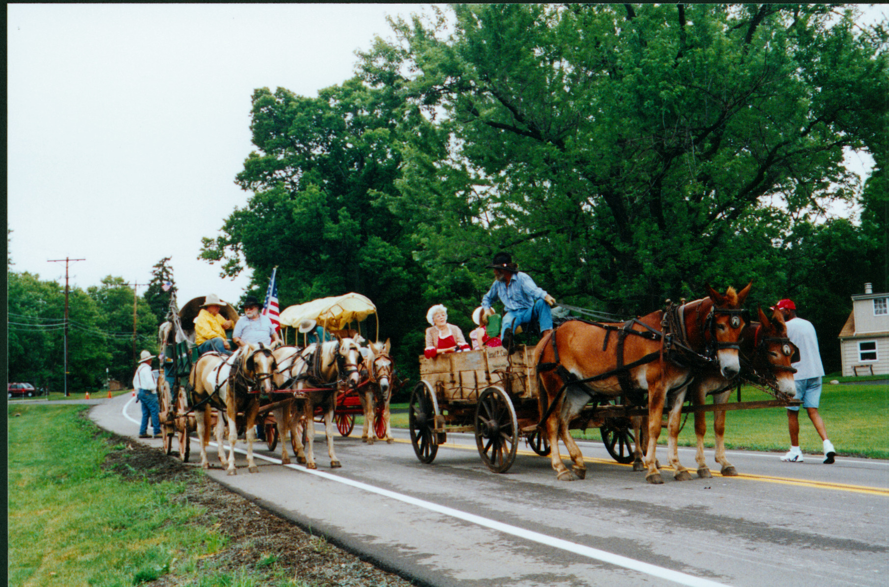 One of the signature events of both the City of Worthington and the State of Ohio's Bicentennial Celebrations was the Wagon Train. The Bicentennial Wagon Train honored the state's early settlers and recognized those whose courageous spirit led to the statehood of Ohio and the founding of the City of Worthington in 1803. The Wagon Train traveled across the State of Ohio from Martins Ferry in the east to New Paris in the west over 24 days, averaging approximately 12 miles per day. Participation in the Wagon Train was open to the public. Many Worthington community members traveled along either the entire route or portions of it. The Wagon Train arrived at the midpoint of its route in Worthington on July 5th, where it led the Homecoming Parade south on High Street from Worthington Galena Road to the Village Green, then west on Dublin Granville Road to Thomas Worthington High School. This photograph shows the wagon train taking a rest on Worthington Galena Road, a short distance from the junction at High Street.