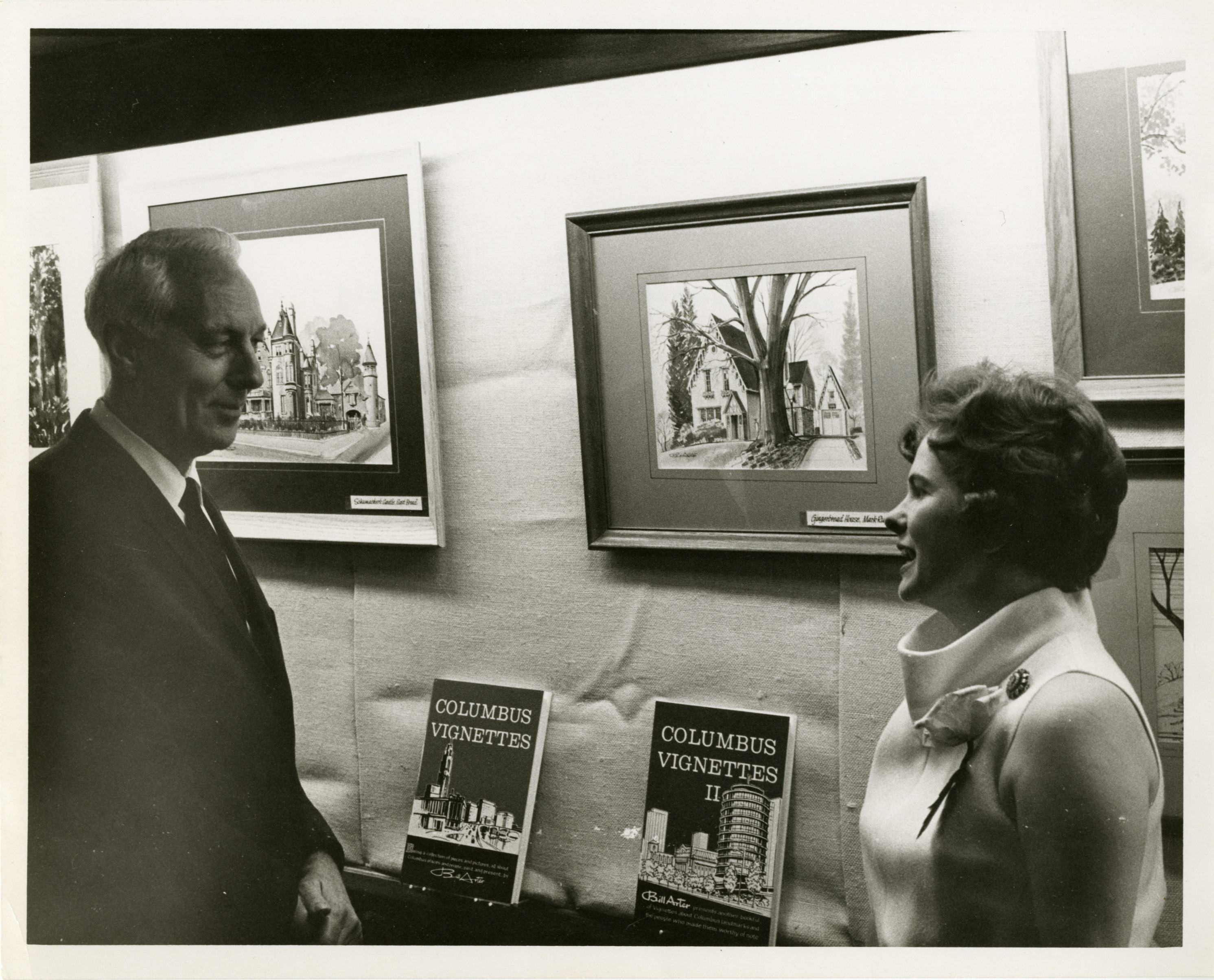 This photograph depicts Worthington artist and author Bill Arter in conversation with Worthington Public Library Director Bernice Daniels at the Worthington Public Library's Open House on April 28, 1968. On a display behind them are the first two volumes of Arter's "Columbus Vignettes," a series that would grow to four volumes and which collected his articles written between March 1964 and July 1971 for the "Columbus Dispatch" Sunday magazine. The articles, which included Arter's pen and watercolor illustrations, highlight the history of sites of interest around Columbus and central Ohio. Also partially visible behind Arter and Daniels are two of his paintings, of the "Schumacher Castle"--Frederick W. Schumacher's mansion on East Broad Street--and of the "Gingerbread House," a residence at 5807 North High that had been home to artist Mark Russell.