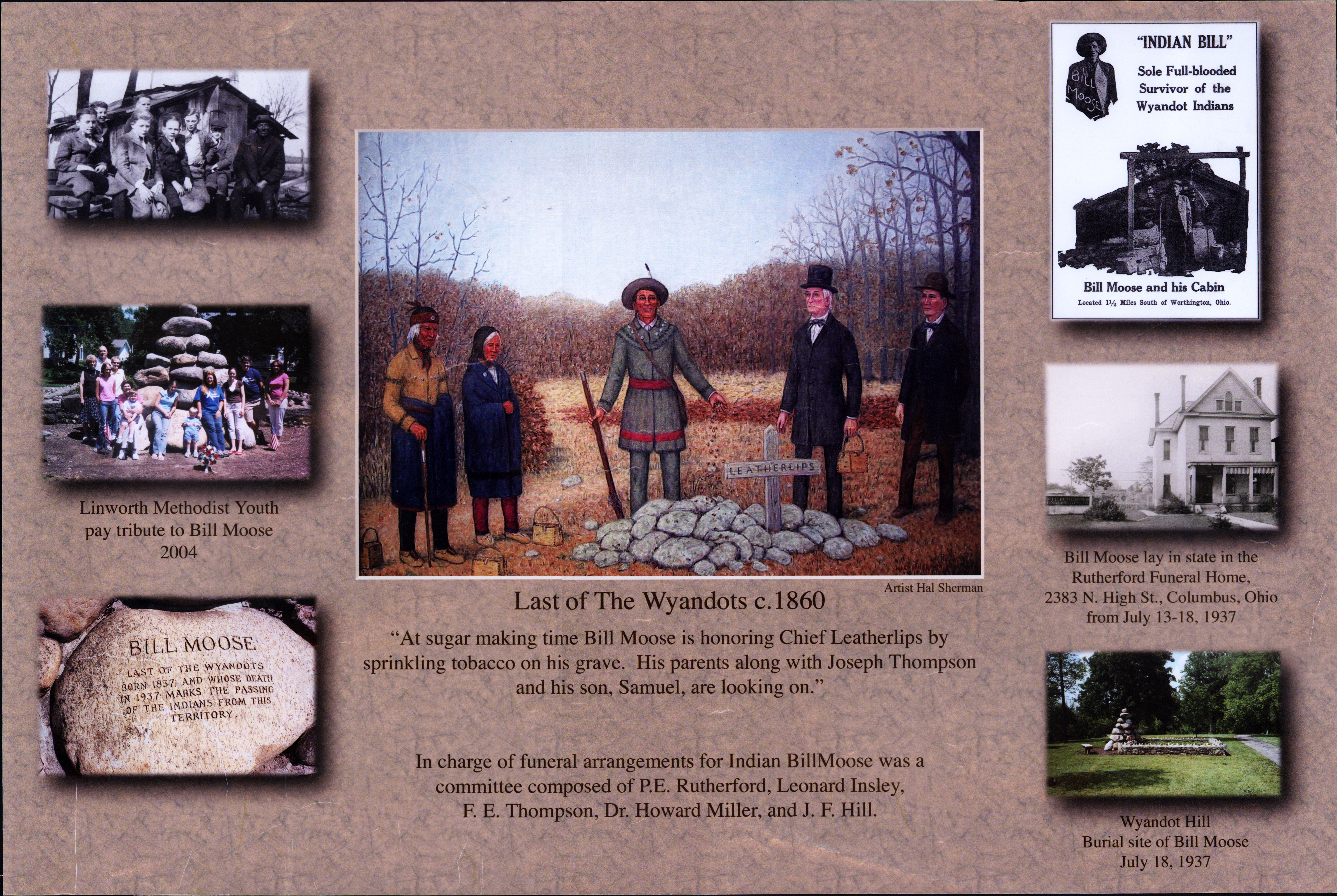 The image in the center of the Bill Moose Commemorative Collage is a painting by Artist Hal Sherman, "Last of the Wyandots C. 1860". Beneath it is a caption "At sugar making time Bill Moose is honoring Chief Leatherlips by sprinkling tobacco on his grave. His parents along with Joseph Thompson and his son, Samuel, are looking on." Along the left had side of the collage are; (top) a photograph dated ca. 1925 of Bill Moose and visiting children at his cabin south of Worthington near Morse Road and the Pennsylvania/New York Central Railroad tracks; (middle) members of Linworth United Methodist Church youth group, Extreme Impact at the Bill Moose burial site during a field trip to honor his memory; (bottom) the inscription on Bill Moose's burial site which reads "Bill Moose Last of the Wyandots Born in 1837 and whose death in 1937 marks the passing of the Indians from this territory". Images along the right hand side of the collage are; (top) Bill Moose's souvenir card that he would sell to visitor of his cabin, printed by Leonard Insley; (middle) Rutherford Funeral Home, where Bill Moose lay in state; (bottom) Wyandot Hill, Burial site of Bill Moose July 18, 1937. The original collage is now located at Rutherford Funeral Home.