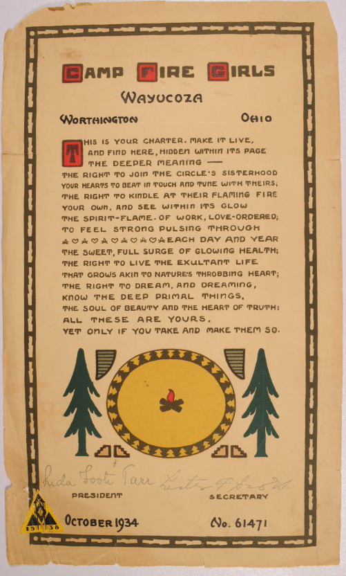 Charter for Camp Fire Girls from the collections of the Worthington Historical Society (WHS) may be used for educational purposes as long as it is not altered in any way and proper credit is given: "Courtesy of the Worthington Historical Society, Worthington, OH." Prior written permission of the WHS is required for any other use of Charter for Camp Fire Girls. Contact WHS at info@worthingtonhistory.org to request permission.
