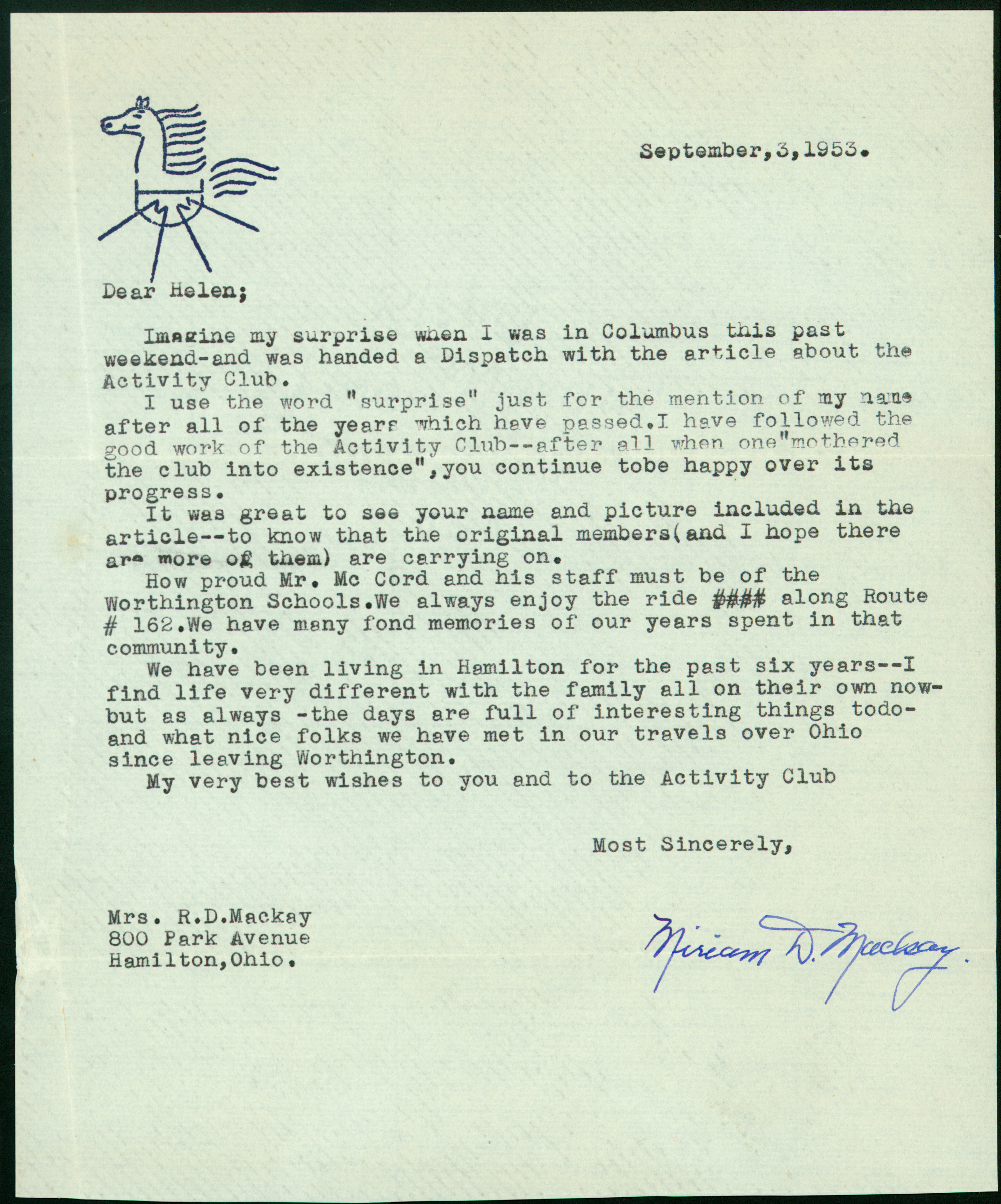 This letter written by Miriam Mackay, the founder of the Activity Club references an article that appeared in the Columbus Dispatch in 1953. Mrs. Mackay moved from Worthington in 1940, but the club she founded has remained in existence since.