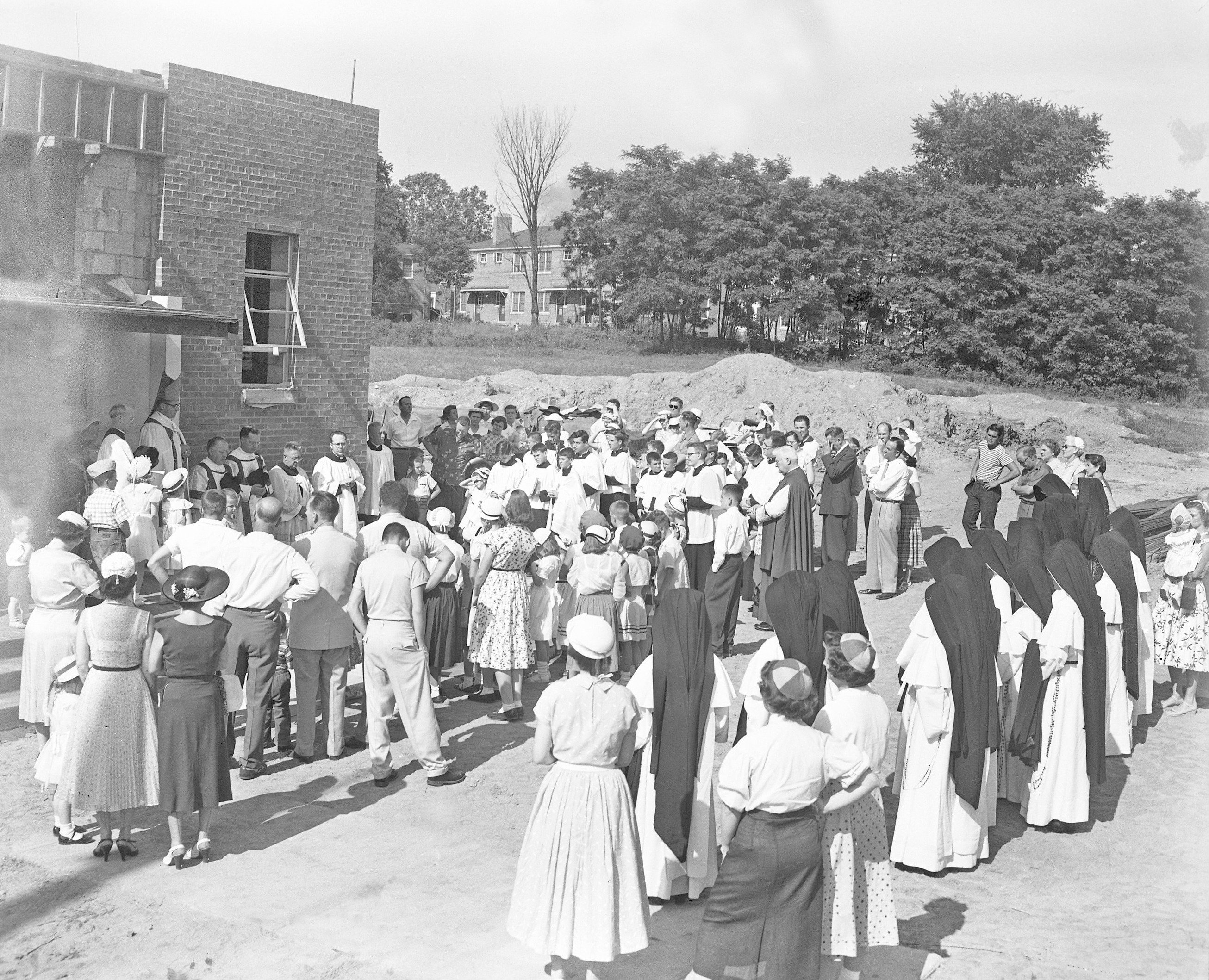 This black and white photograph shows the crowd gathered to watch the installation of a cornerstone and time capsule at the Saint Michael parish school on Sunday, June 20, 1954, during the final months of building construction. In the background is the partially constructed building, with a row of church officials facing out towards the crowd. The crowd includes adults and children wearing what appear to be their church-going clothes. A row of nuns stands towards the back of the crowd. Mounds of dirt from the construction are visible in the background of the picture.