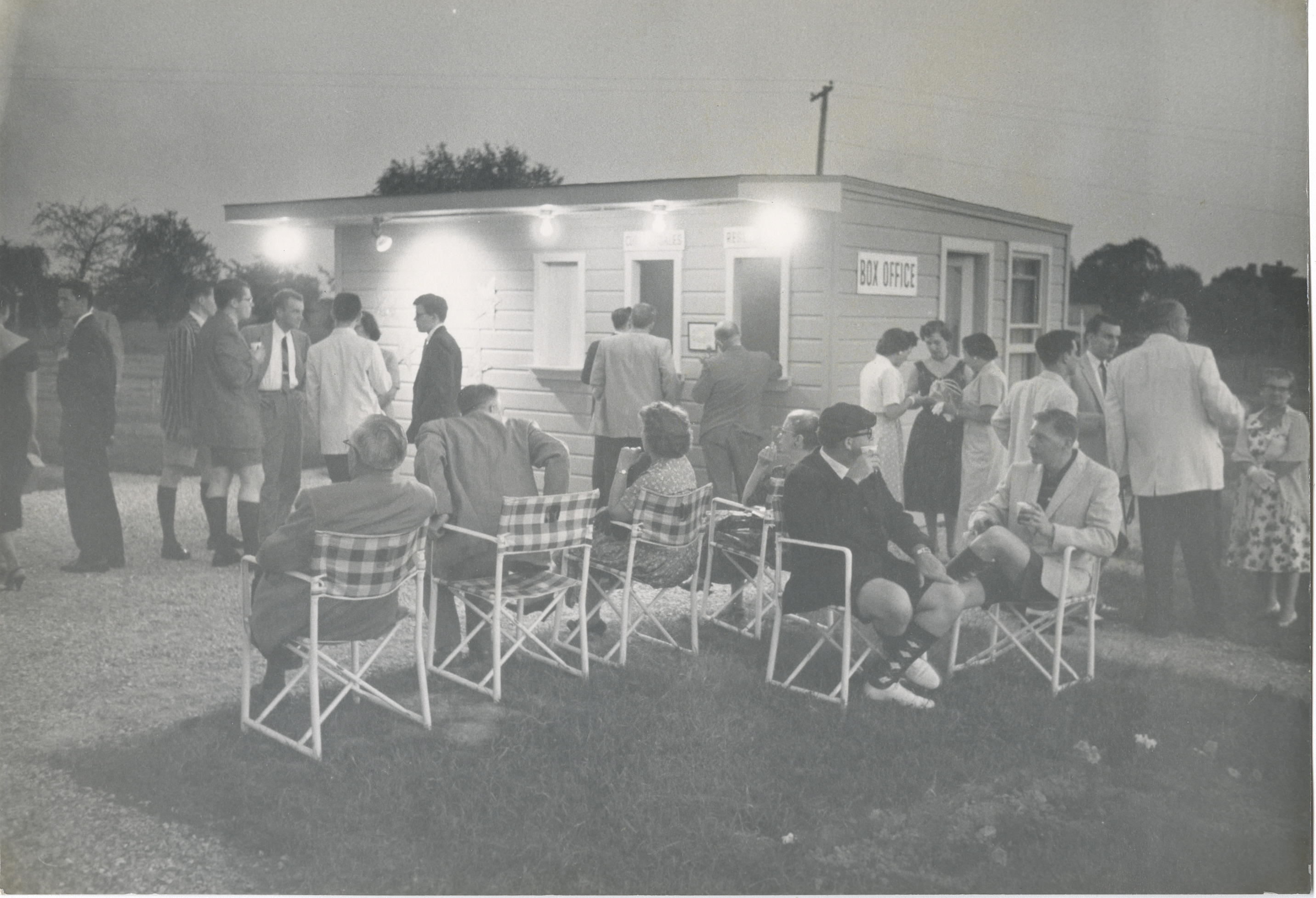This black-and-white photograph shows a crowd gathered around the box office at Playhouse on the Green at dusk. A couple dozen people are shown sitting and standing in small groups, with the box office behind them lit up with several lights and fields and trees visible in the background. The photograph is undated, but was likely taken the week of June 11-16, 1956, as handwriting on the back indicates that it was from a performance of "Seven Year Itch," which ran that week.