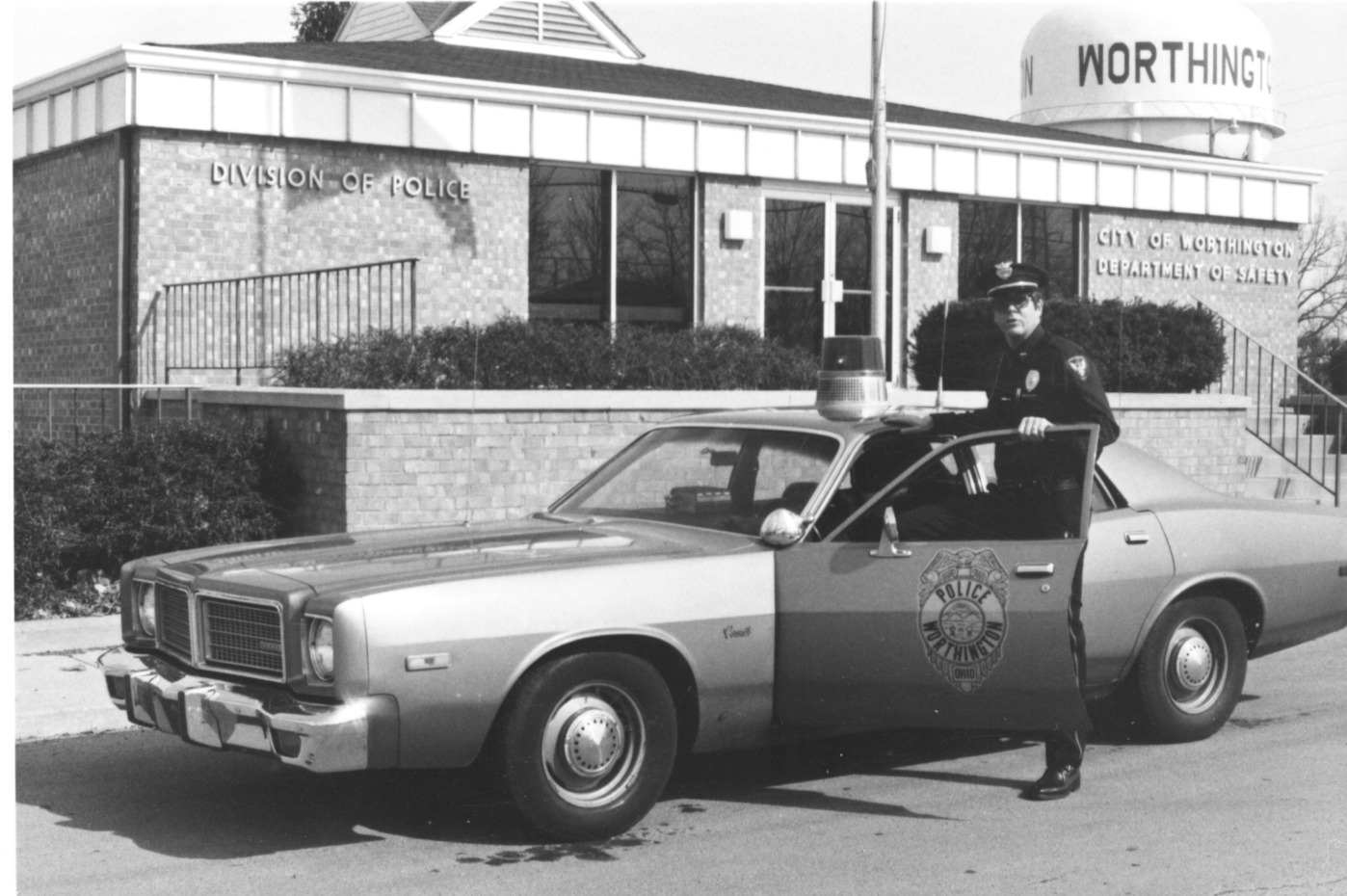 Worthington Police Officer and squad car are pictured in front of the Highland Avenue Safety Bulding. Worthington's Divison of Police operated from this location from 1970 to 2002, when Police Headquarters moved to its new facility at 6555 Worthington-Galena Road.
