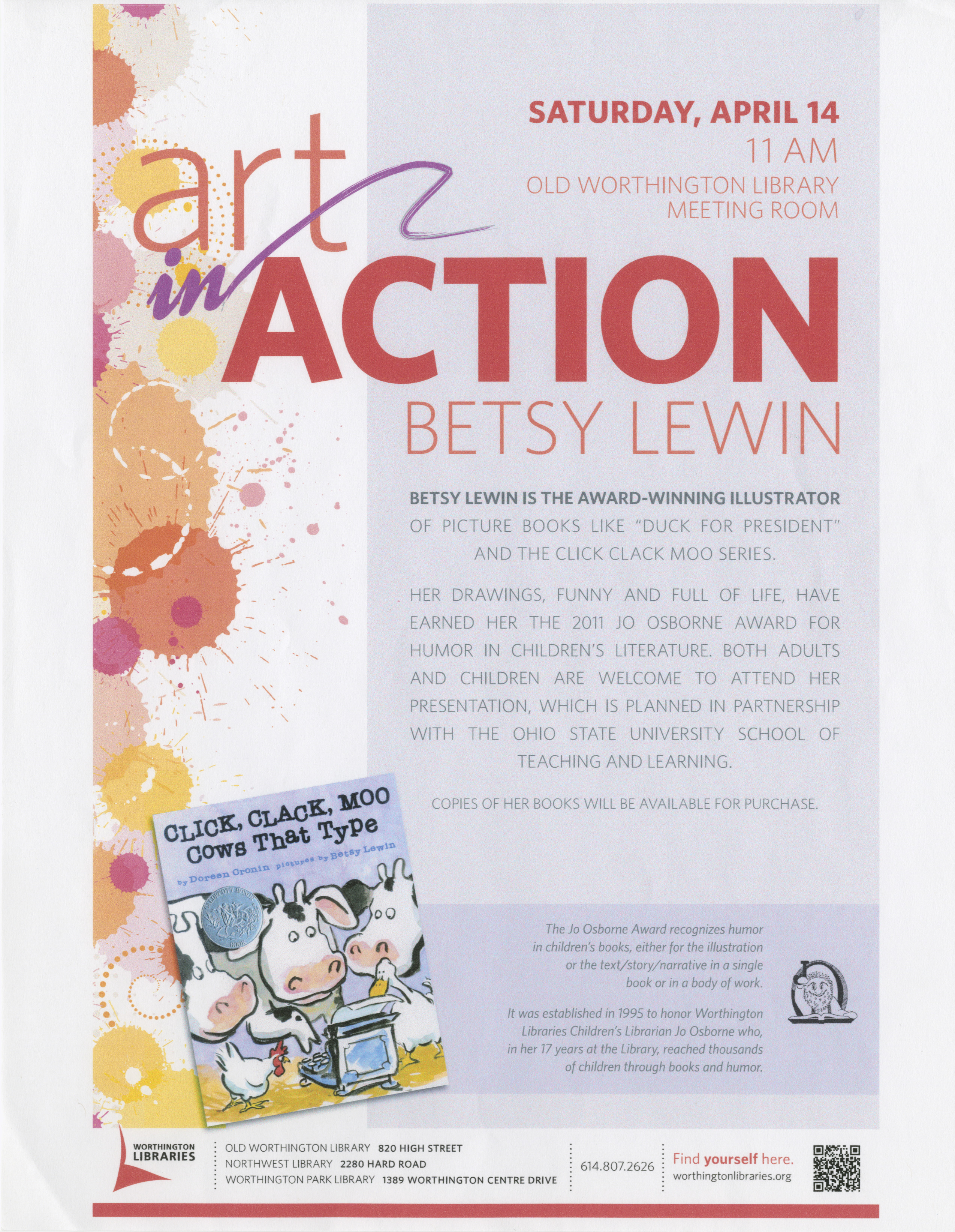 Shown here is the flier for a Worthington Libraries program featuring author and illustrator Betsy Lewin. She was in Worthington to accept the 2011 Jo Osborne Award for Humor in Children's Literature, and gave this presentation on her creative process for children and adult attendees.