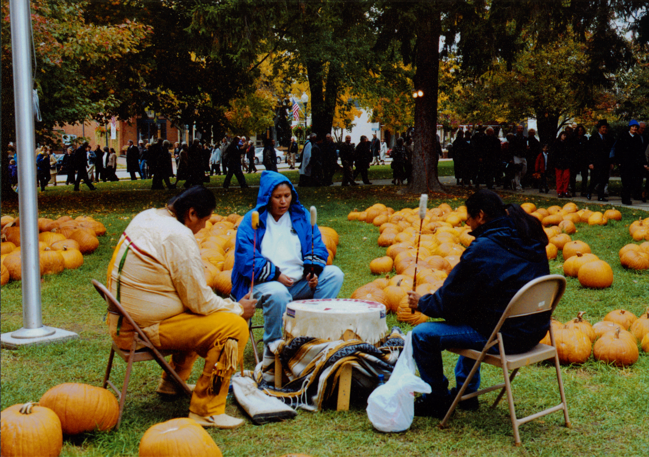 Participants in the interfaith Founders Day Service of Thanksgiving were greeted by the Morning Star Drum Group upon arrival to the Worthington United Methodist Church. Members of the group are Larry White, Randy Church, Richard Jacob, Debbie White, and John Williams. Prayers were chanted with drums accompanying.