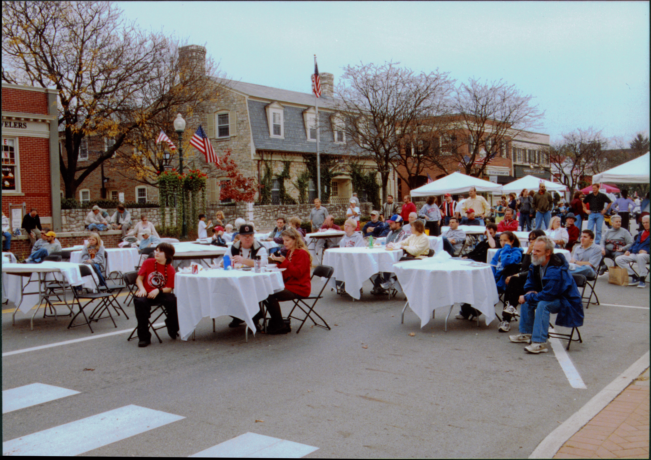 This view of StreetFest at Founders Weekend 2003 looks southeast across High Street from the crosswalk near the south end of the Village Green. Hundreds of people gathered for one of central Ohio's favorite autumn pastimes, watching Ohio State football. The OSU Vs Indiana football game was projected on a large outdoor video screen.