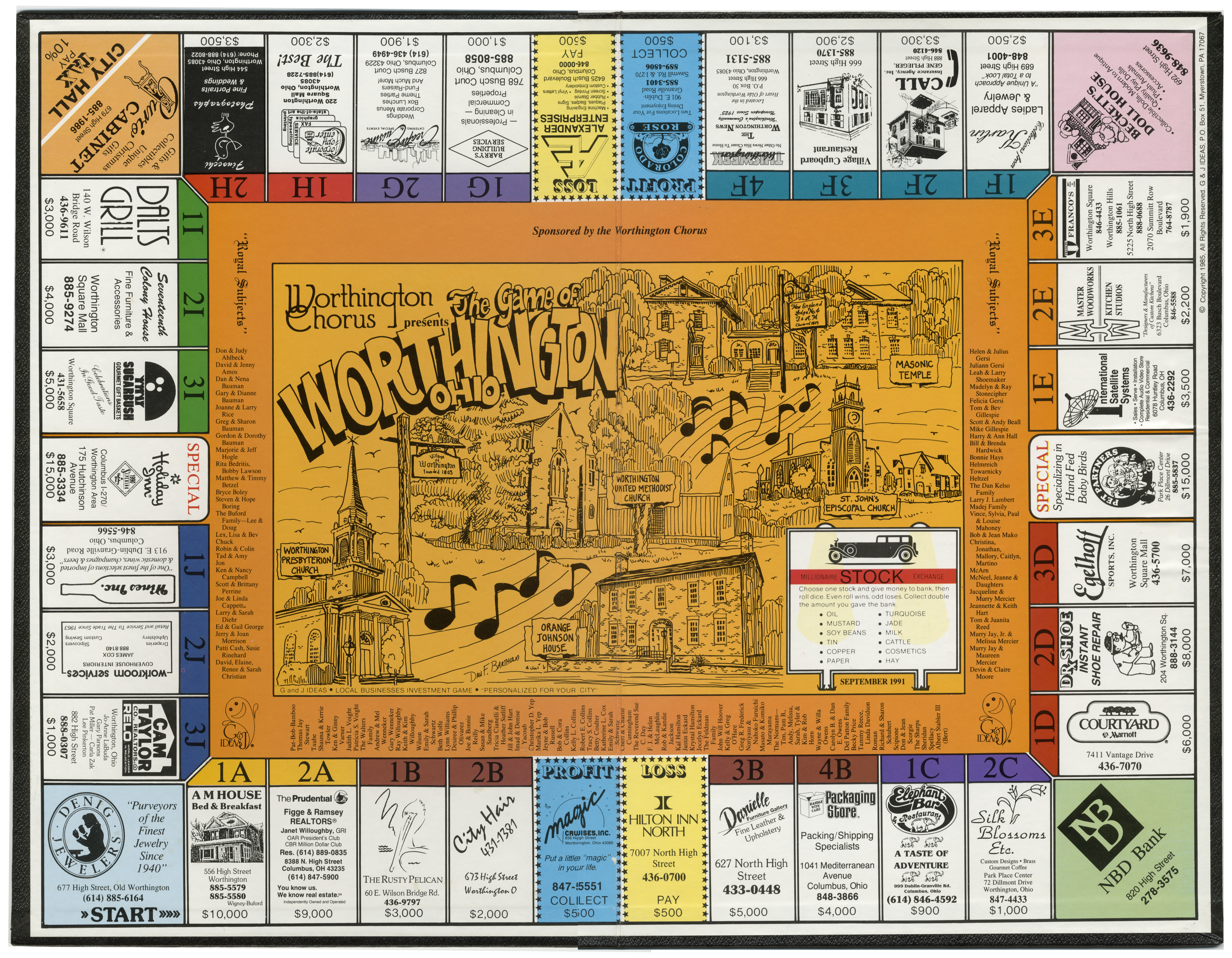 According to an article in the December 14, 1992 "Worthington News ThisWeek," the board game was sold as a fundraiser for the Worthington Chorus, benefiting their Worthington Chorus Music Scholarship Fund. Games could be purchased for $12 at at the A.M. House Bed and Breakfast, which was located at 556 High Street, or for an additional fee the games could be gift-wrapped and shipped anywhere. A “Christmas Special” was offered that year, where for $25 a gift-wrapped game would be hand-delivered anywhere in the Worthington school district by costumed chorus members with a singing greeting.
