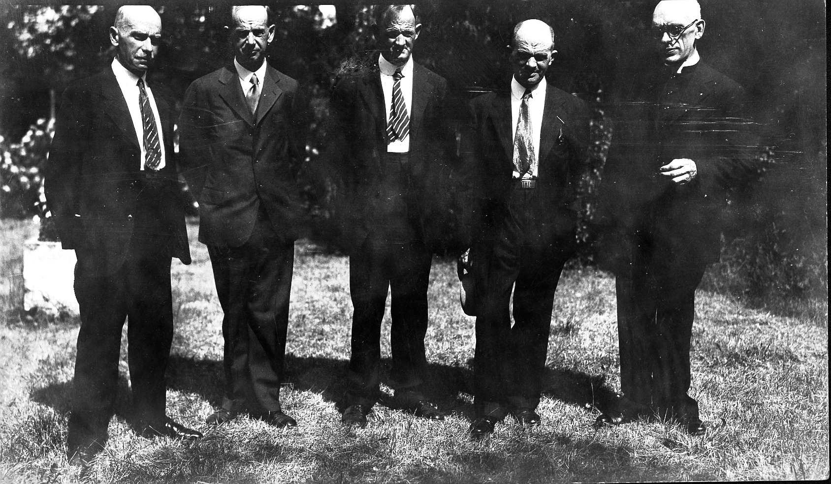 Pictured here are Griswold brothers outside the Griswold Inn, identified as (left to right) William Lawrence Griswold, Howard Lee Griswold, Herbert W. Griswold, and George H. Griswold and Rev. Edwin Viets Griswold. They were five of fourteen children born to Worthington Franklin Griswold and Fondelia Ruth Griswold. Worthington and Fondelia Griswold raised the family in the former Griswold Inn, which was built by the men’s great-grandfather Ezra Griswold in 1811. The Inn stood adjacent to the north-east quadrant of the Village Green until the building was razed in 1964.