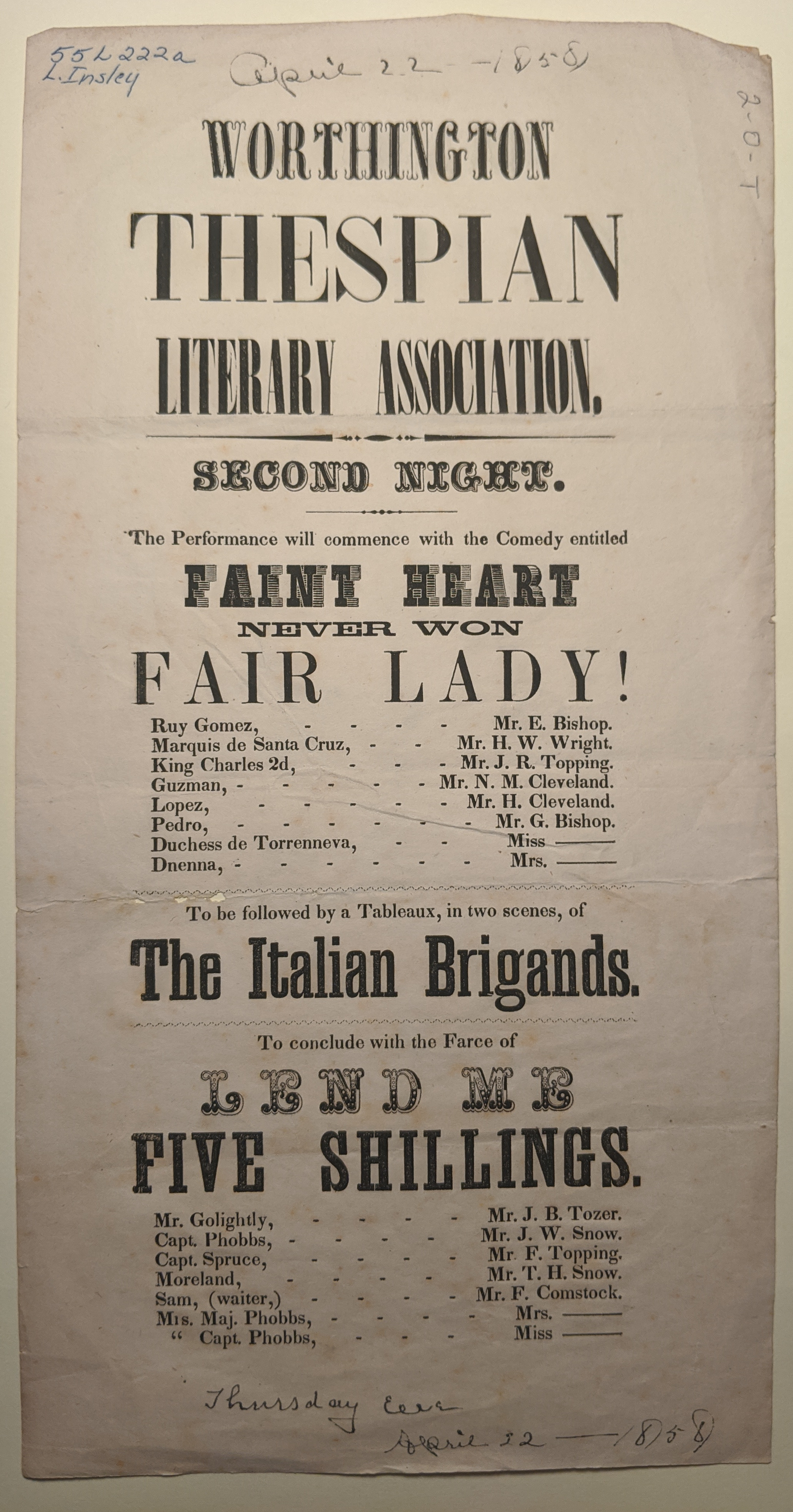 This handbill is for the Worthington Thespian Literary Association Second Night production of "Faint Heart Never Won Fair Lady!" "The Italian Brigands" and "Lend Me Five Shillings" performed on Thursday, April 22, 1858. Performers included Mr. E. Bishop, Mr. H. W. Wright, Mr. J. R. Topping, Mr. N. M. Cleveland, Mr. H. Cleveland, Mr. G. Bishop, Mr. J. B.Tozer, Mr. J. W. Snow, Mr. F. Topping, Mr. T. H. Snow and Mr. F. Comstock.
