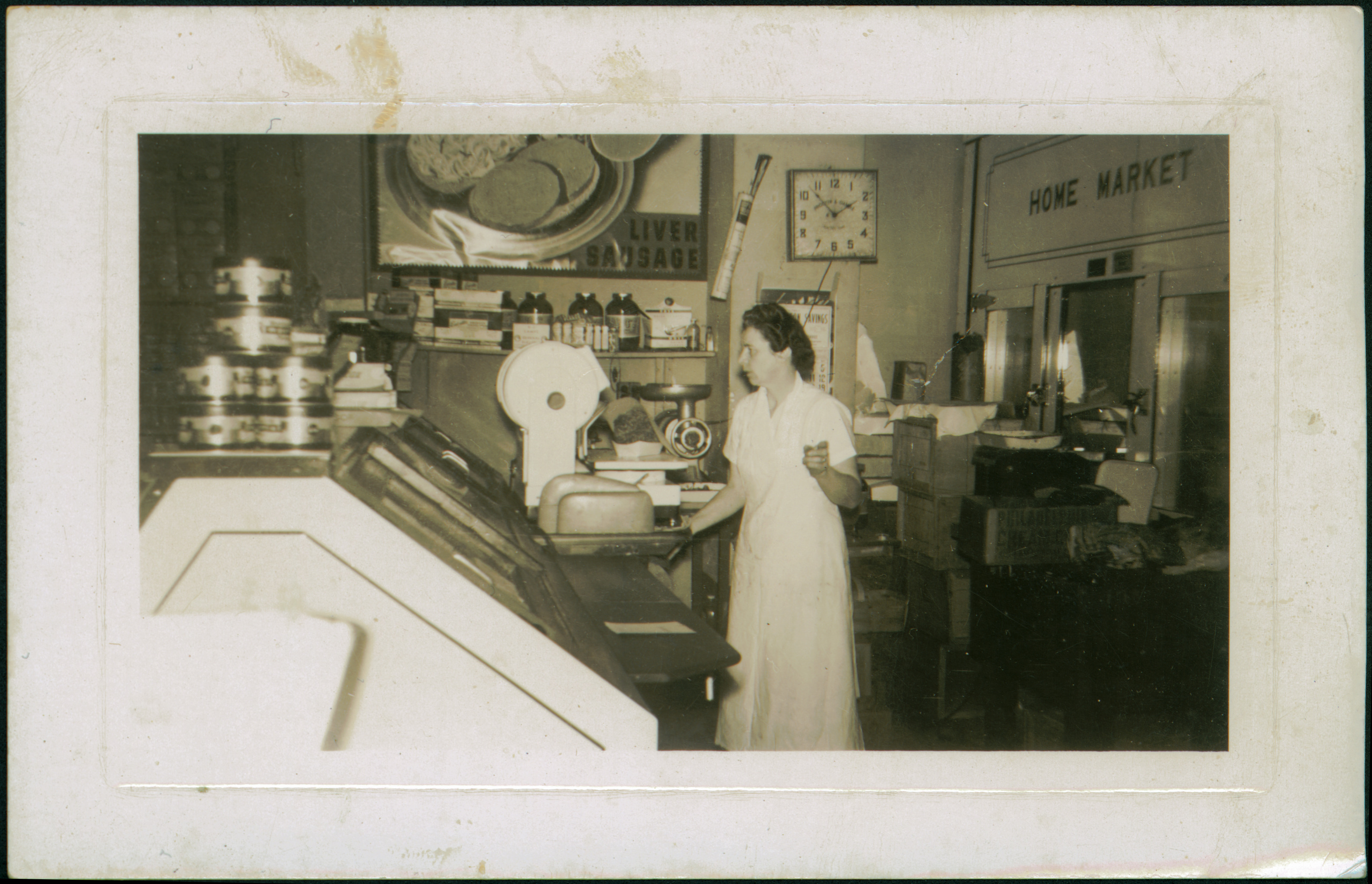 The interior of the Home Market is shown here in 1943, with Edith Snouffer working at the deli. Edith made the salads and other deli foods. The Home Market was located at 660 High Street, and offered a complete line of groceries including baked goods, frozen foods, and fresh and smoked meats. Clyde Bachelor opened the business in 1929, eventually handing the business down to his son, David Bachelor. Scottie Macbean Coffeehouse later operated at that location, now home to Jet’s Pizza.