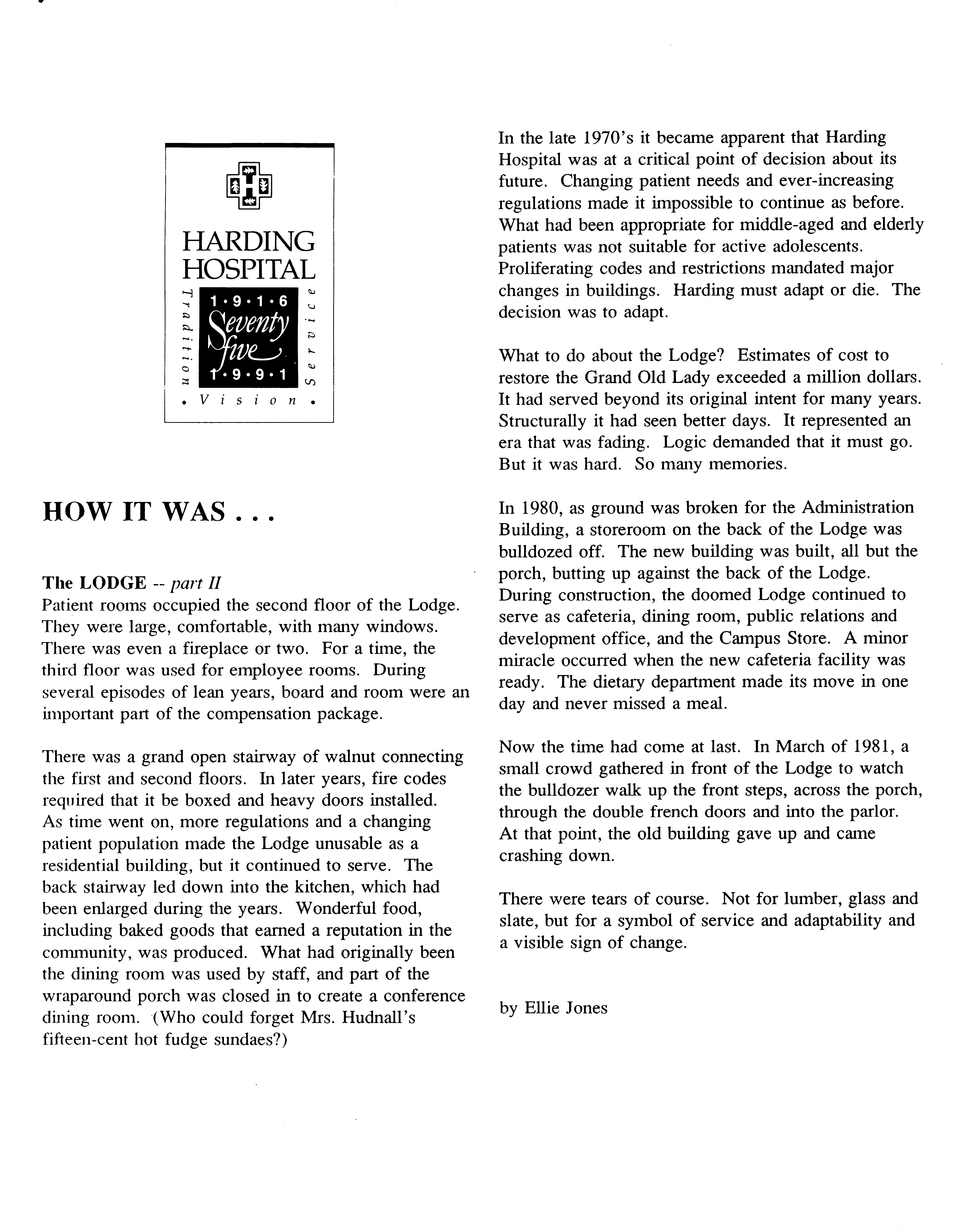 This is one in a series of articles on the history of Harding Hospital. Included in the newsletter distributed to hospital employees, the articles were written by Ellie Jones, Harding Hospital archivist. This article is part two of two to explore the history of the building on the Harding Hospital campus that was known as the Lodge. The Lodge served as a patient residence as well as cafeteria, meeting place and chapel from 1919 until its demolition in 1981.
