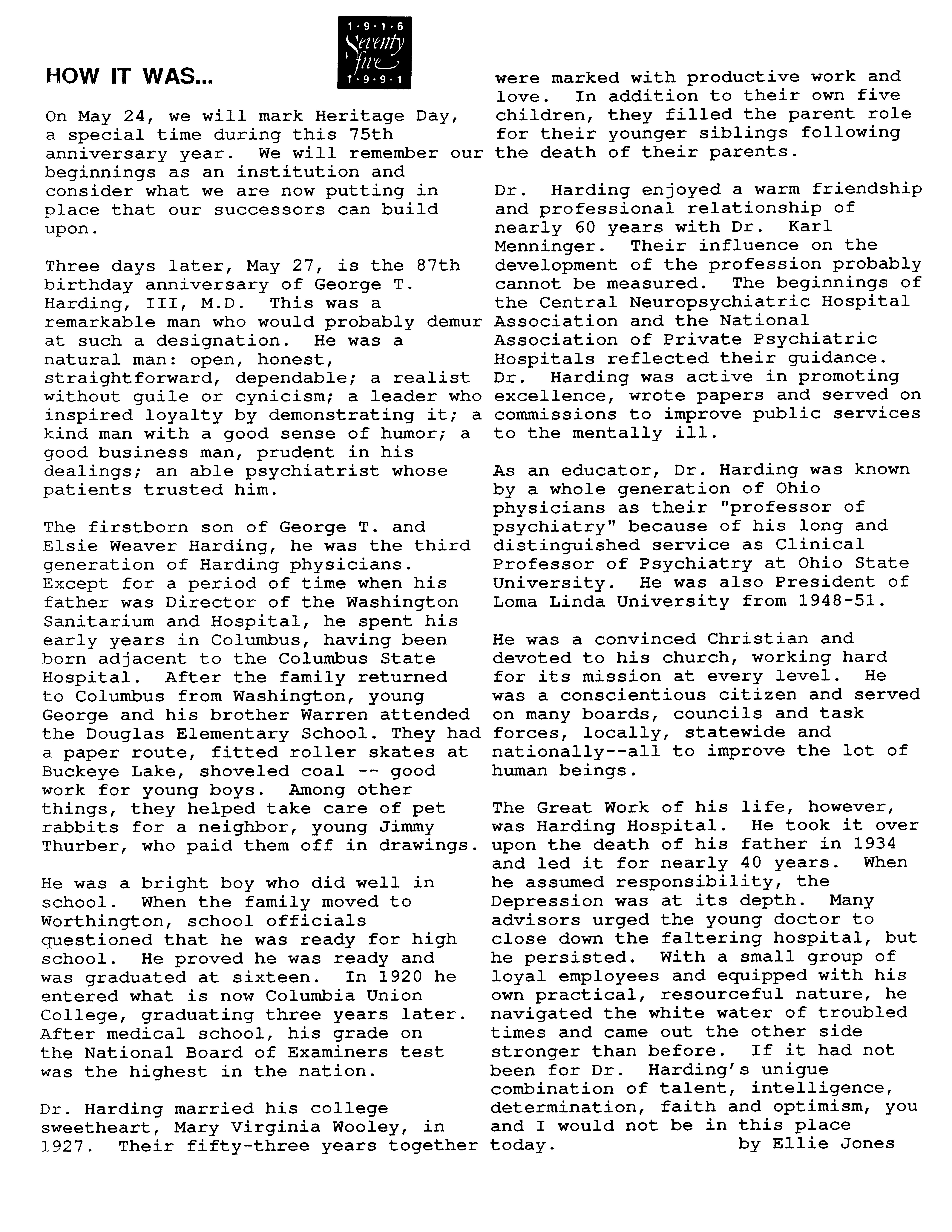 This is one of a series of articles on the history of Harding Hospital. Included in the newsletter distributed to hospital employees, the articles were written by Ellie Jones, Harding Hospital archivist. This article is a remembrance of Dr. George T. Harding III on the occasion of his eighty-seventh birthday.