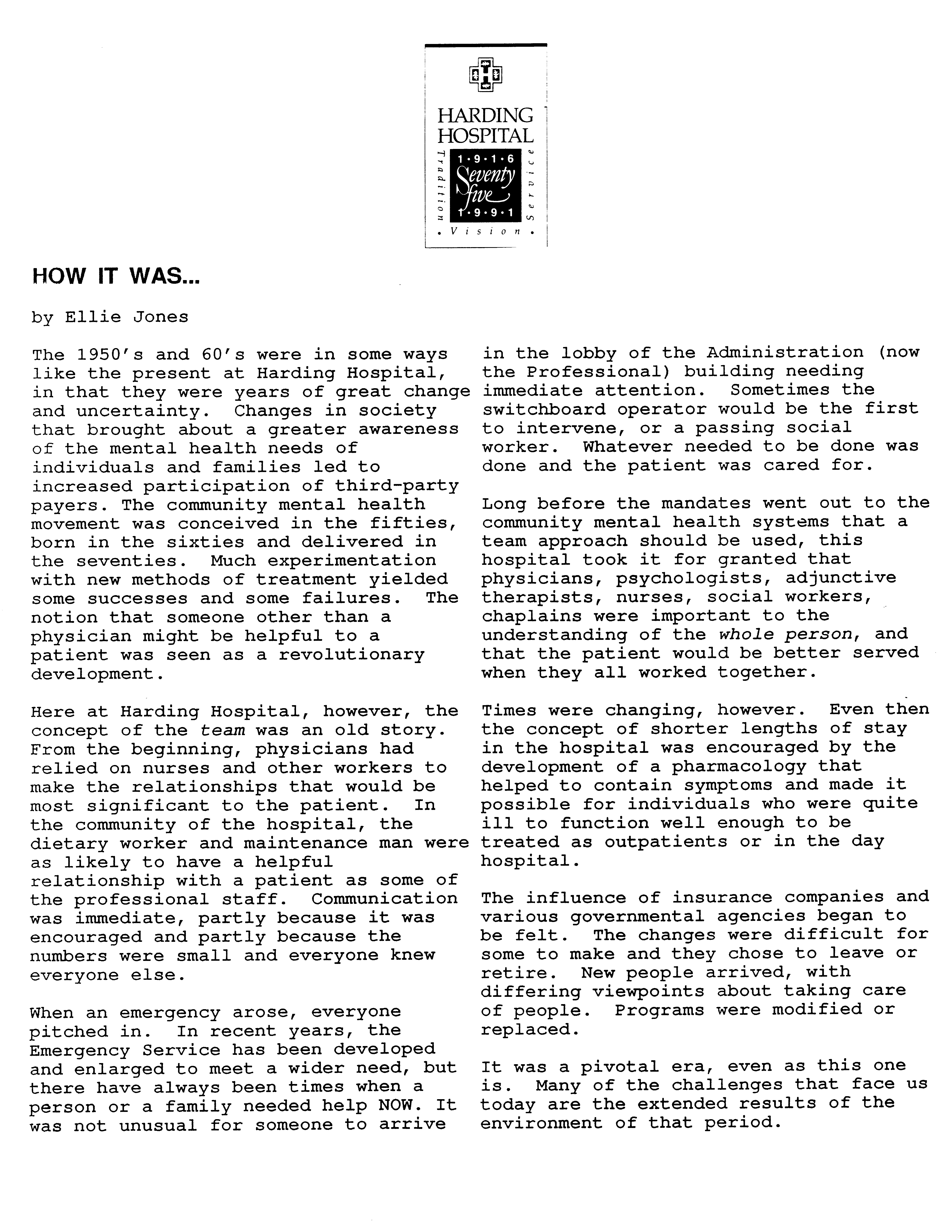 This is one in a series of articles on the history of Harding Hospital. Included in the newsletter distributed to hospital employees, the articles were written by Ellie Jones, Harding Hospital archivist. This article focuses on societal changes in the 1950s and 1960s affecting the methods of mental health treatment at Harding Hospital, as well as the value of teamwork among the staff at Harding.