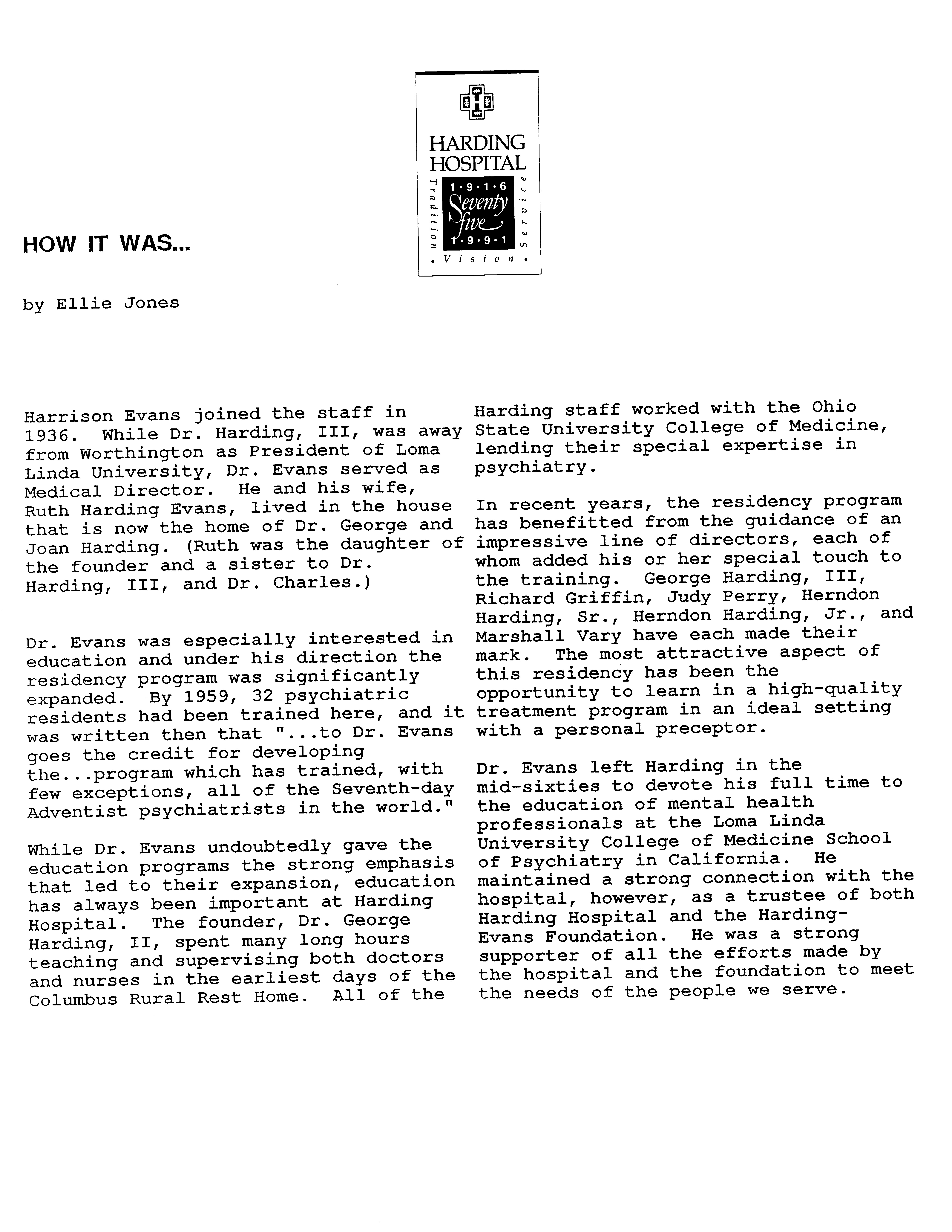 This is one in a series of articles on the history of Harding Hospital. Included in the newsletter distributed to hospital employees, the articles were written by Ellie Jones, Harding Hospital archivist. This article explores the impact that Dr. Harrison Evans had on the hospital’s residency program, as well as briefly explores its development in the decades following his departure in the mid-1960s.