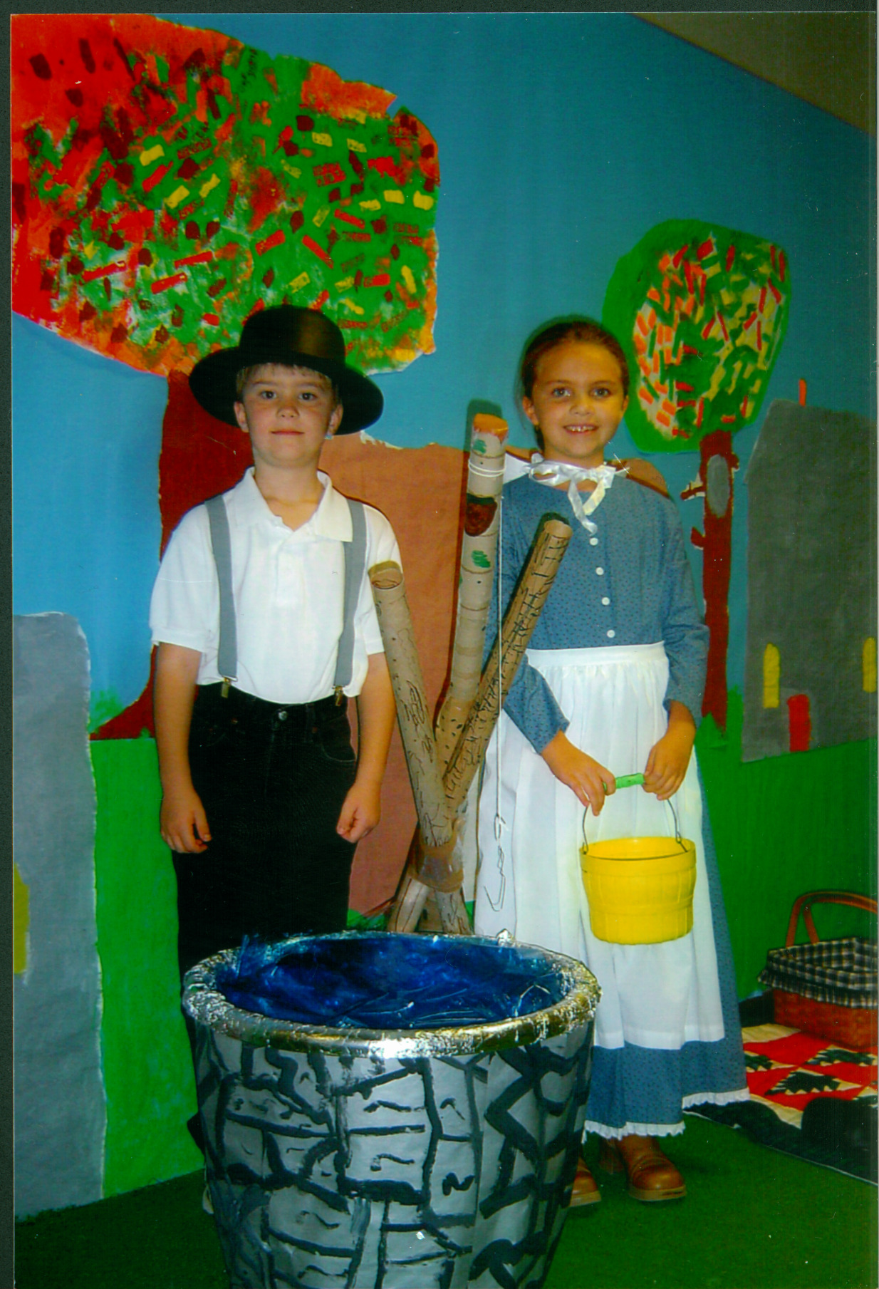During Worthington's Bicentennial year Granby Elementary students participated in a two-part Bicentennial project, "A Village Called Worthington/If Walls Could Talk". The students learned about the changing landscape of old Worthington from 1803 to 2003 as they studied architecture, people and modes of transportation. The second phase of the project, called "If Walls Could Talk" involved each grade level, first through sixth. Students in each grade researched the history and architecture of selected buildings in Old Worthington and created a large scale 3-D replica of each landmark. Parents were invited to attend an open house where students dressed in period costume and answered questions about the historical development of their buildings. Families strolled the halls learning about Worthington history. Second grade students are shown here portraying early settlers with their topic, the Village Green.
