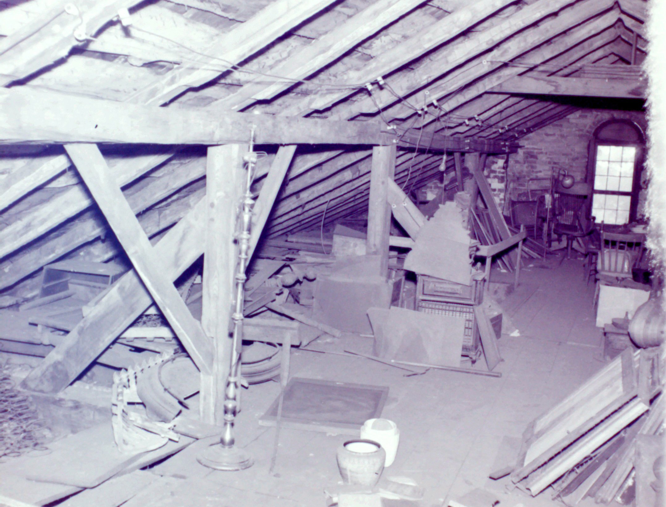 This image shows the attic which ran the length of the home facing the Village Green with windows on the east and west ends. Note the hand-hewn rafters from the 1811 construction. Parts of the structural beams were salvaged during demolition and integrated into the lower-level museum display cases at the Orange Johnson House.