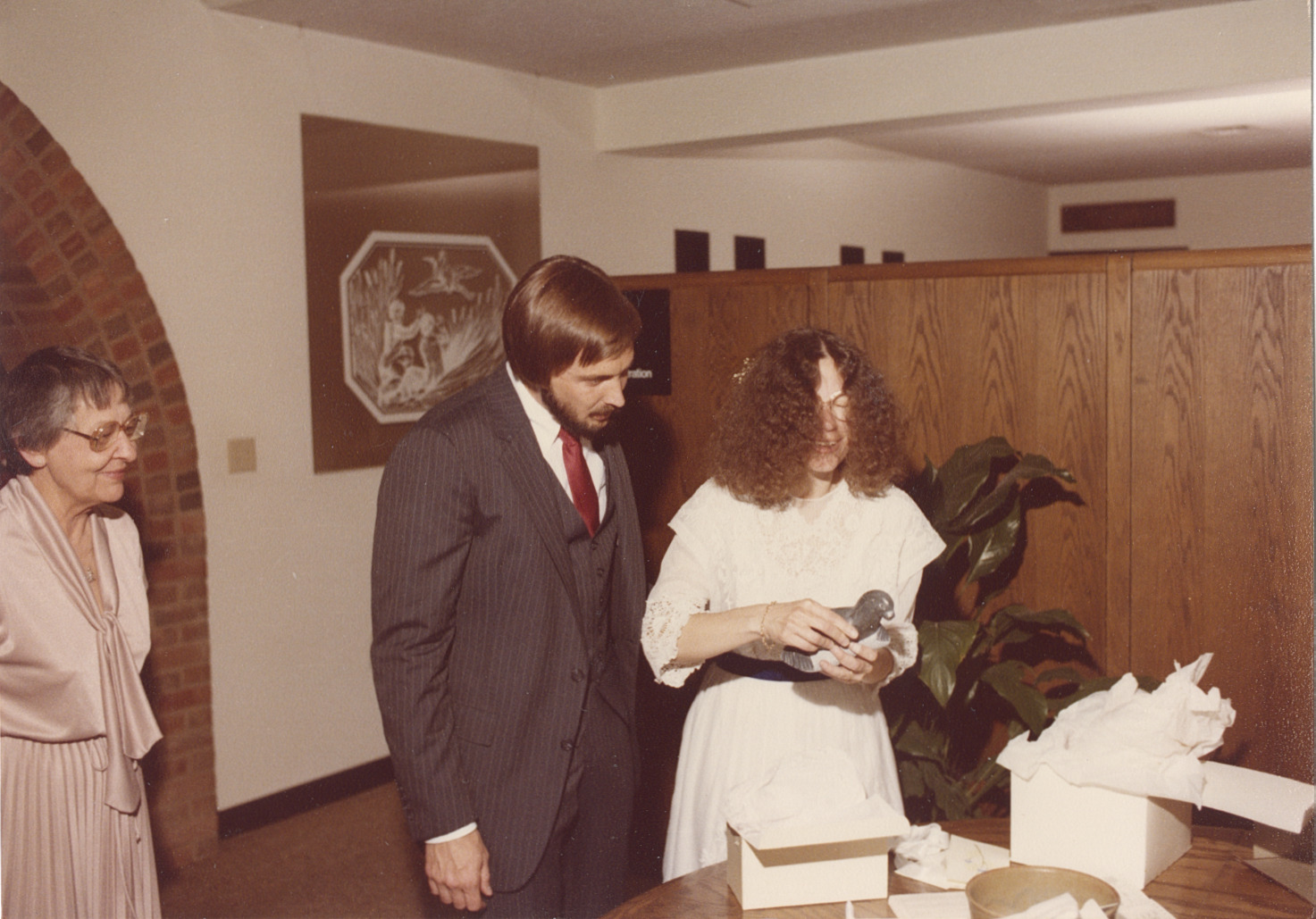 Pictured in this color photograph are, left to right, librarian Joan Brennan, Bob Foulk and librarian Rachel Alexander. They are at the Old Worthington Library for Foulk's and Alexander's wedding, May 8, 1982. Brennan and Foulk look on while Alexander is shown holding and smiling at a wedding gift to her and Foulk from staff, which she has just unwrapped. The gift is an Inuit sculpture of a seal.