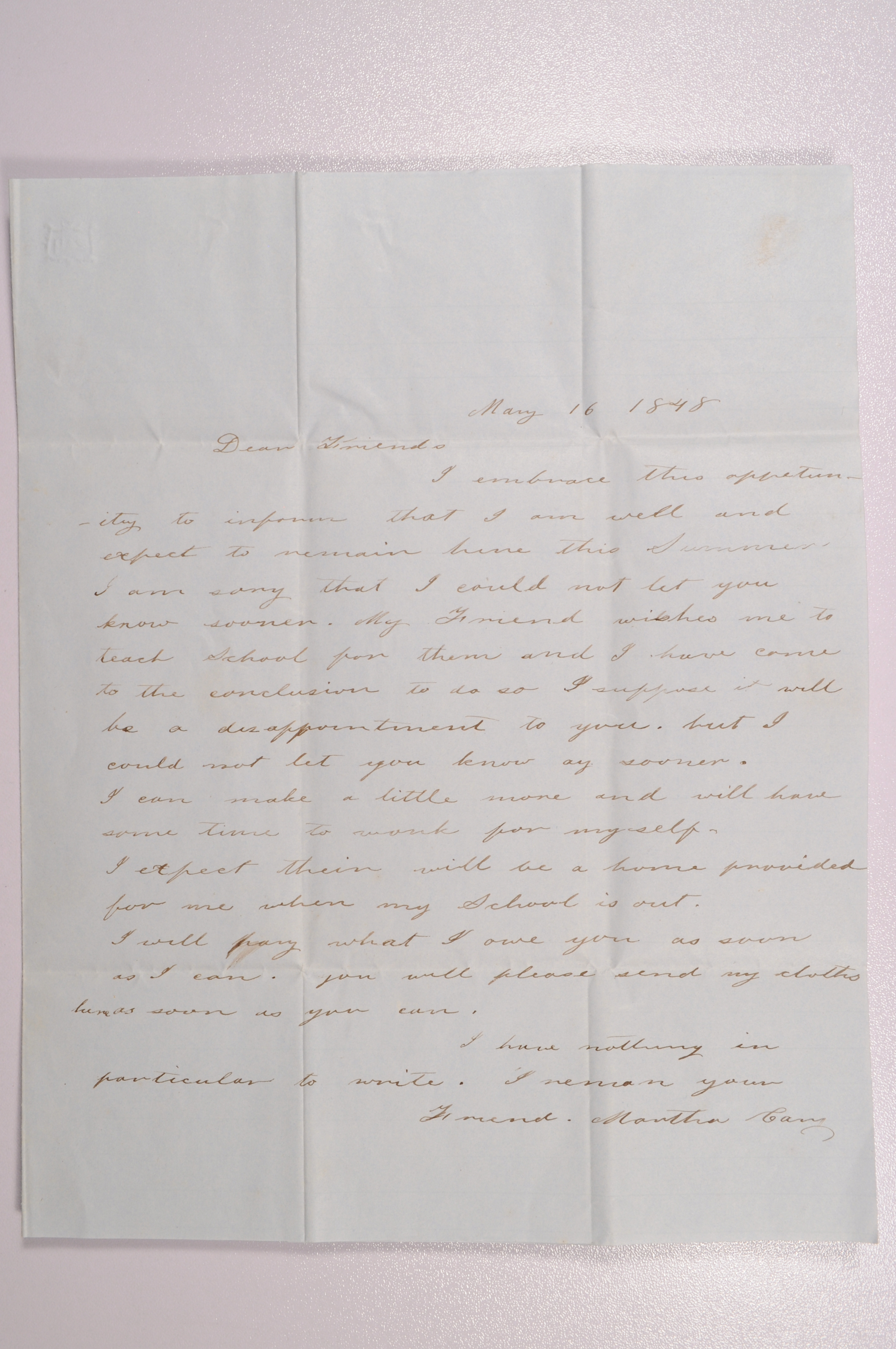 Martha Cary, a former boarder, writes to Achsa to inform her that she will not be returning. She had an offer to teach school for the summer, and would be able to make a little more money. She promises to pay the money that she owes as soon as possible, and requests that Achsa send her clothes.