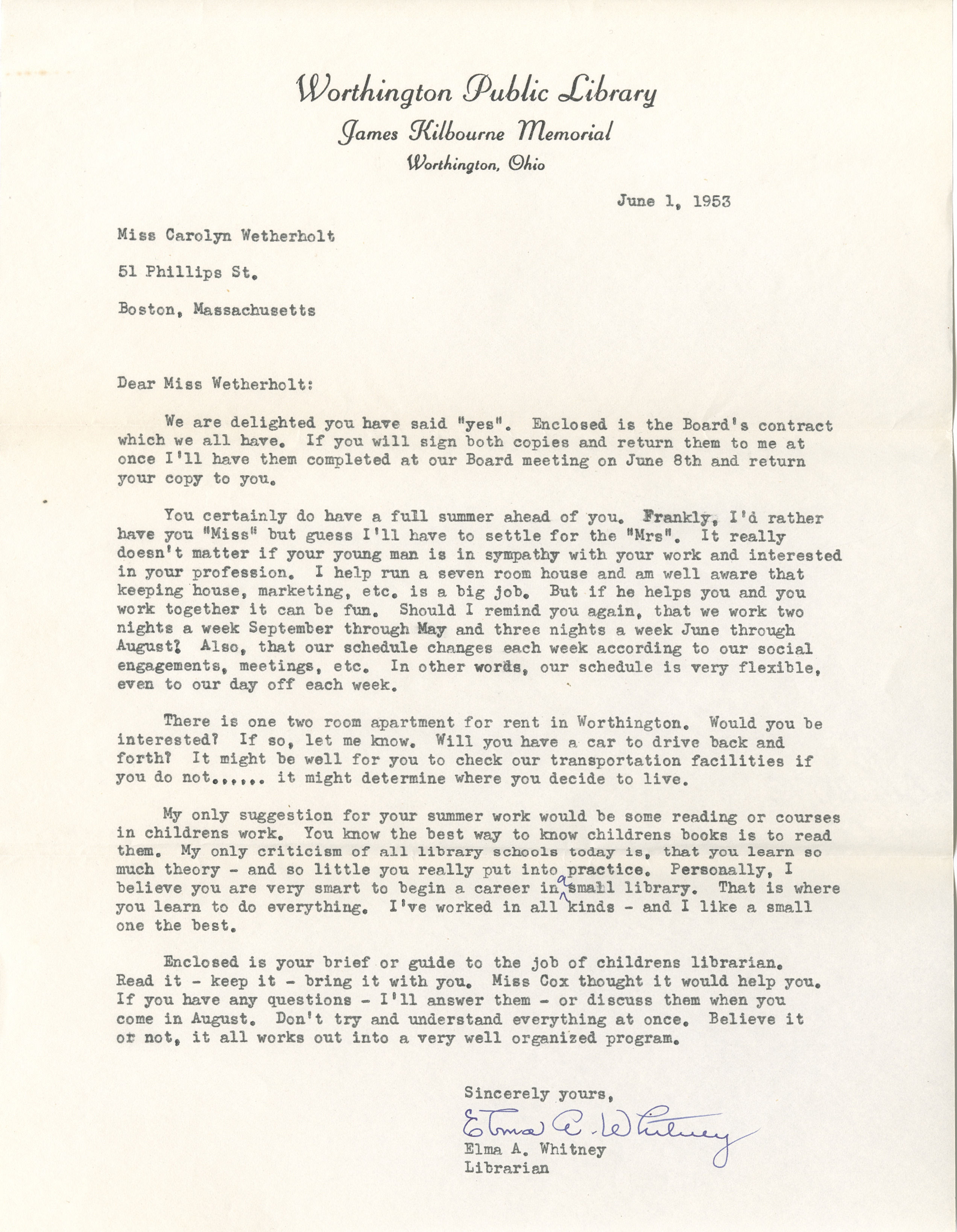 This one-page, typed letter is from Worthington Public Library Head Librarian Elma A. Whitney to Carolyn Wetherholt, welcoming her to her new job as children's librarian at the library. It mentions the library board's contract for Wetherholt to sign and return, explains the library's work schedule, a room for rent in Worthington and transportation needs for Wetherholt, suggestions for summer work to prepare for the job, and a guide to the job of children's librarian.