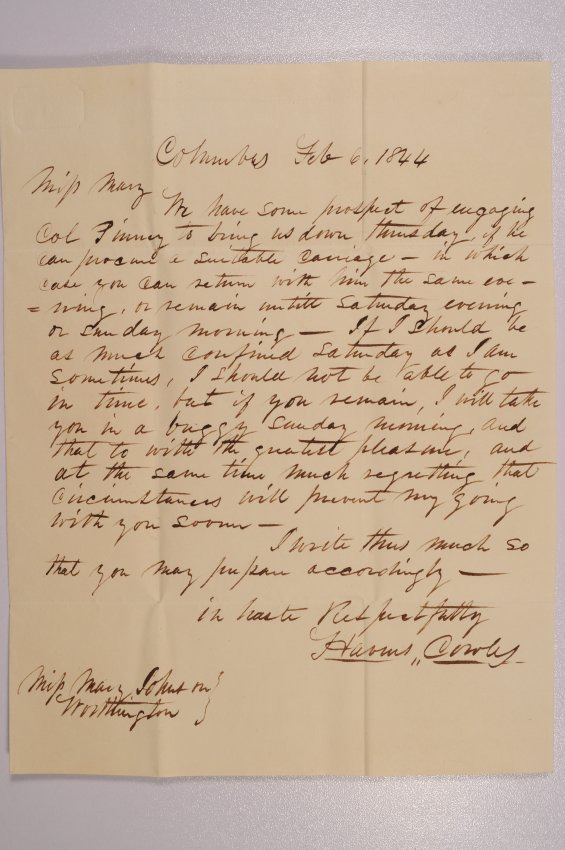 This letter was written to Mary Johnson of Worthington, Ohio from Havens Cowles of Columbus, Ohio to inform Mary of her travel options for returning to Worthington after an upcoming visit to Columbus. Cowles notifies Miss Johnson that there are two possible options by which she can return home depending on her needs. She can return with Col. (Levi) Pinney, another important Worthington resident, on Thursday if Col. Pinney can secure a carriage or she can wait until Sunday when Cowles himself can bring her home. While this note may appear to be of little importance today, it shows that in 1844 a trip between Columbus and Worthington was something that required advanced planning and often spanned more than a day.