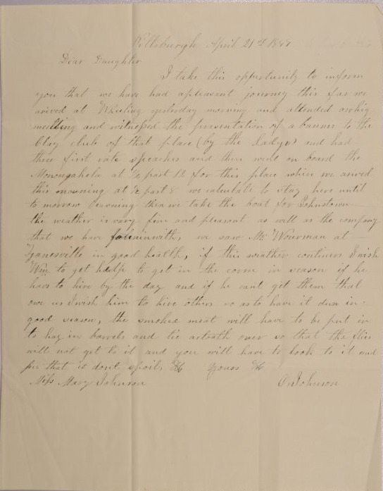 In this letter from Orange Johnson of Worthington to his daughter, Mary, he lets her know that his trip to Pennsylvania is going well. He talks briefly about the Whig meeting that he attended and about the weather. Lastly he reminds Mary to do her chores.