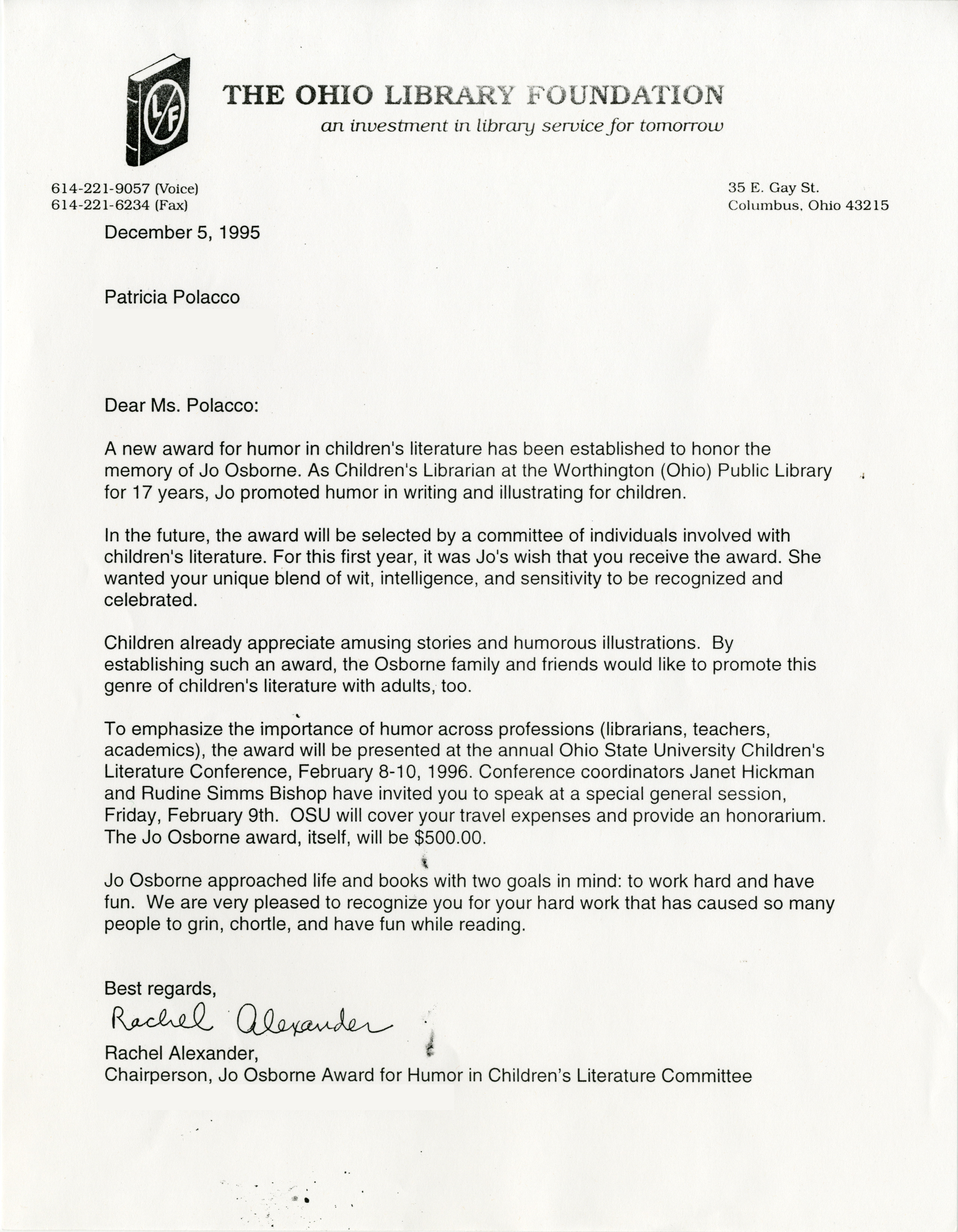 This is a copy of a letter sent from Rachel Alexander to author Patricia Polacco, announcing her selection as the first winner of the Jo Osborne Award for Humor in Children's Literature, which was established in memory of librarian Jo Osborne. In the letter, Alexander writes that, although future winners of the award would be chosen by a committee of those involved with children's literature, Osborne had specifically wished for Polacco to be selected as the first winner.