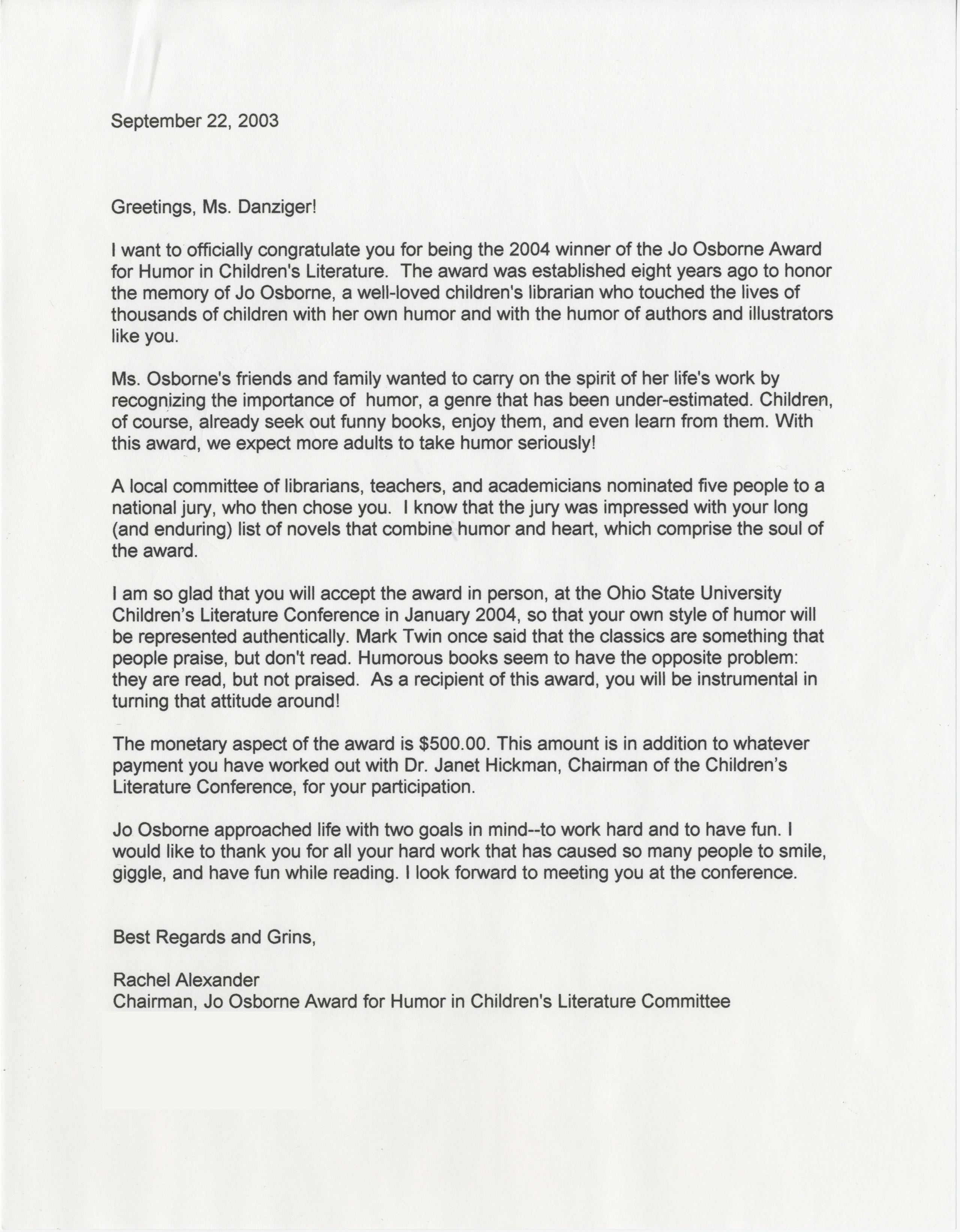 This is a copy of a letter sent from Rachel Alexander to author Paula Danziger, announcing her selection as the 2004 winner of the Jo Osborne Award for Humor in Children's Literature, which was established in memory of librarian Jo Osborne.