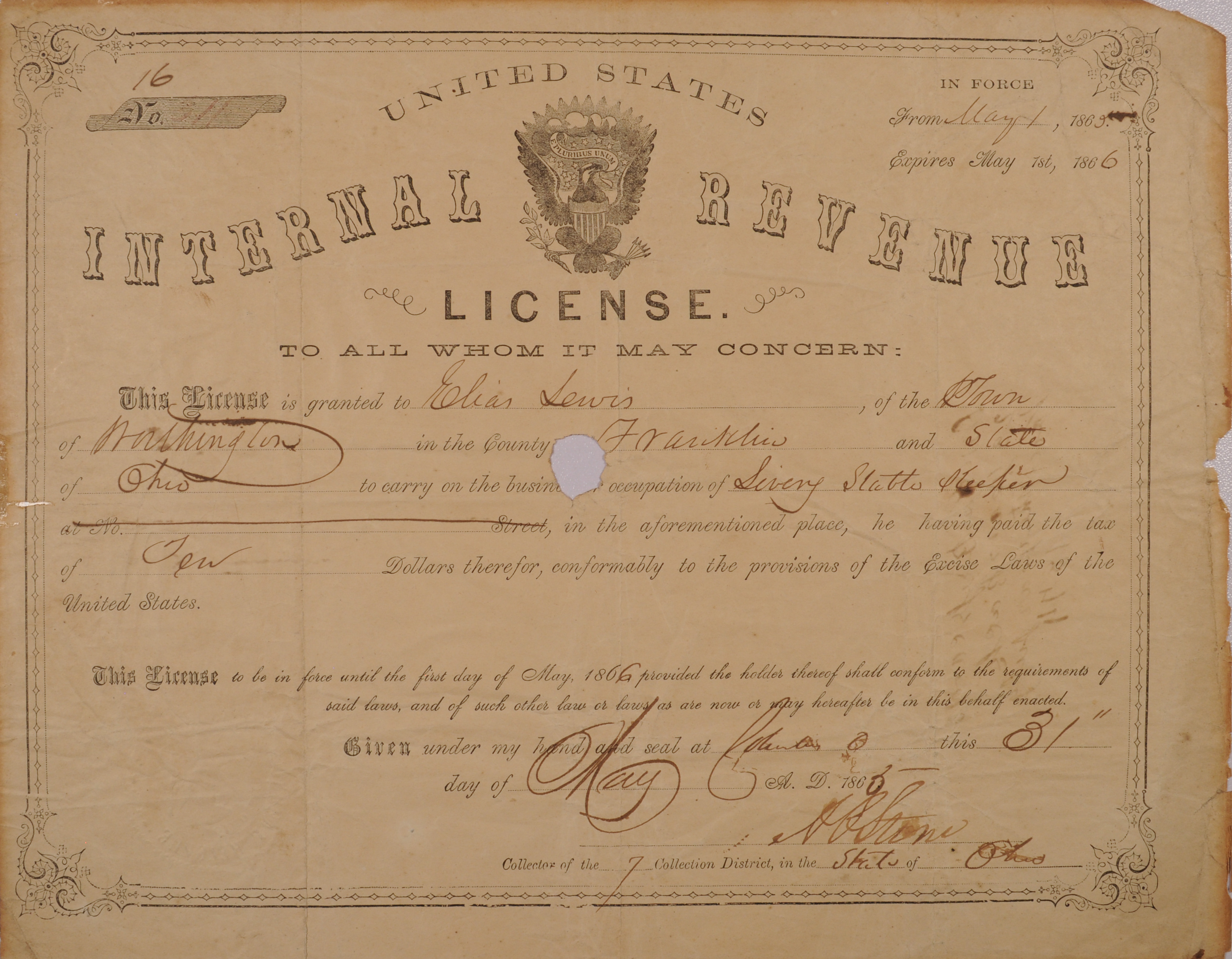 This document is a United States Internal Revenue License that was issued to Elias Lewis in 1865 for the keeping of a livery in Worthington. It reads, "This license is granted to Elias Lewis, of the Town of Worthington, in the County of Franklin, in the State of Ohio to carry on the business or occupation of Livery Stable Keeper in the aforementioned place, he having paid the tax of Ten dollars, therefore conforming to the provisions of the Excise Laws of the United States." Among his numerous professional endeavors, Elias Lewis operated a horse-drawn omnibus between Worthington and Columbus. His son, Worthington Columbus Lewis, operated a similar enterprise between Westerville, Worthington and Flint.