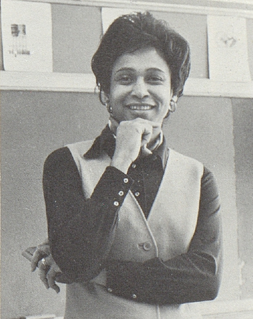 Pictured in this black-and-white photo is teacher Lillian Macer as she appeared in the Worthington High School 1971 "Cardinal" yearbook. She is shown smiling at the camera, standing in front of a chalkboard with her arms crossed and hand against her chin.