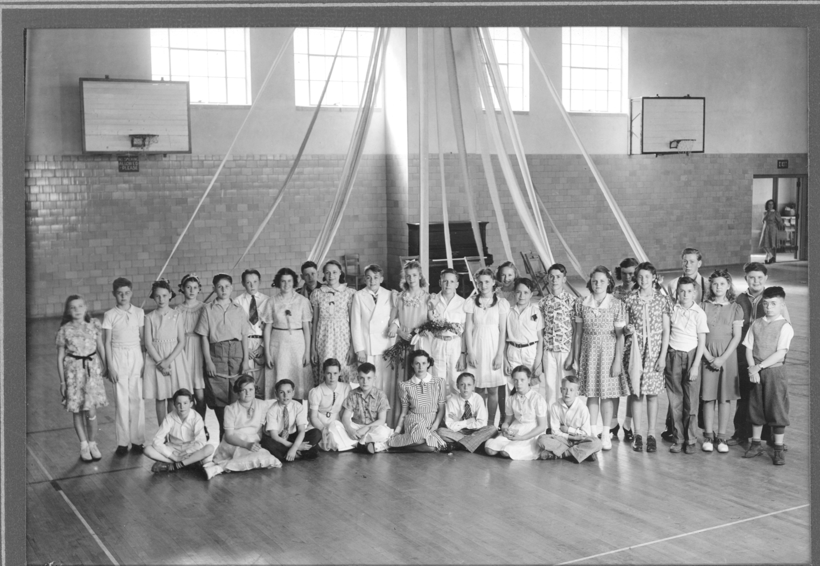 Worthington Elementary School sixth graders celebrated May Day, 1940 with a party in the new school's gymnasium, decorated for the occasion. Students are identified as; (standing) Antoinette East, Kenneth Kayner, Judy Nocker, Barbara Buel, Russell Whiteis, Bill Lindamore, Phebe Johns, Raymond McCann, Joann Hurlbert, Tom Hartman, Jane Hoag, Bill Hamilton, Sally Gooby, Virginia Gooby, Jack Pruden, Fred Weaver, Ellenor Rowland, Jene Kerr, Dona Farbutton, Tom Snouffer, Jr. Dill, Mary Butts, Belford Griffith, and David O'Brien; (seated) Tim Blodgett, Molly Morgan, Jim Hanson, Janet Howard, Sam Harsh, Miss Marting (teacher), Wayne Jewett, Janet Arnston, and Norman Ellston. In 1938 a new elementary and junior high school was built at 50 East Granville Rd., now Kilbourne Middle School.