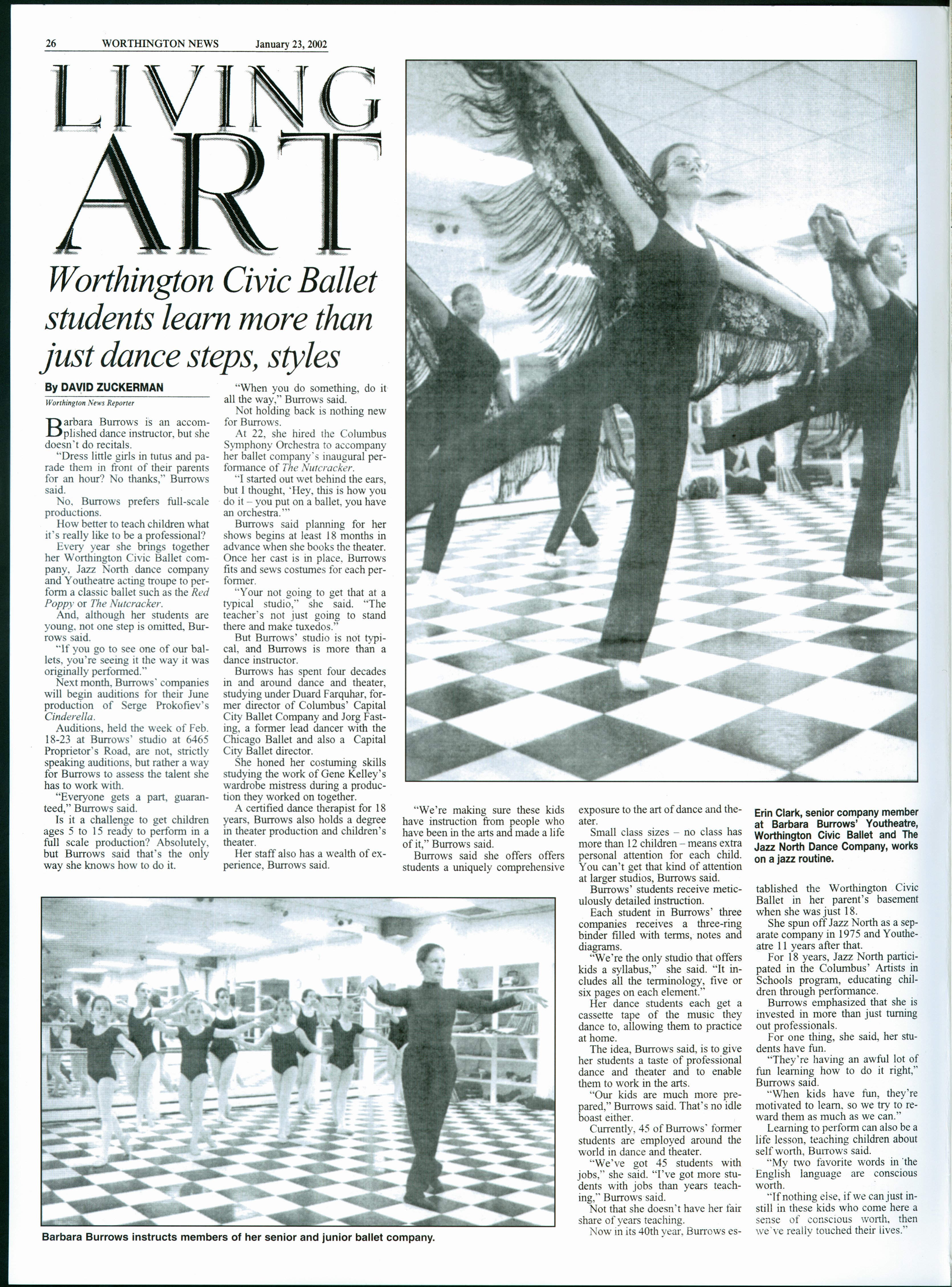 The Miss Burrows Fine Arts Scholarship was created in 2003 in the honor of Barbara Burrows, owner and director of the Worthington Civic Ballet and Jazz North Dance Companies, and Youtheatre of Worthington. Beginning in 2004, annual scholarships were awarded to graduating seniors with diverse interests and experiences in the fine arts. Recipients of the scholarship were also presented with a copy of a folio containing articles previously published in the Worthington News (reproduced with permission) featuring Miss Burrows' contributions to fine arts education in Worthington. This is the first page of the scholarship folio, featuring an article originally published in the Worthington News on January 23, 2002.