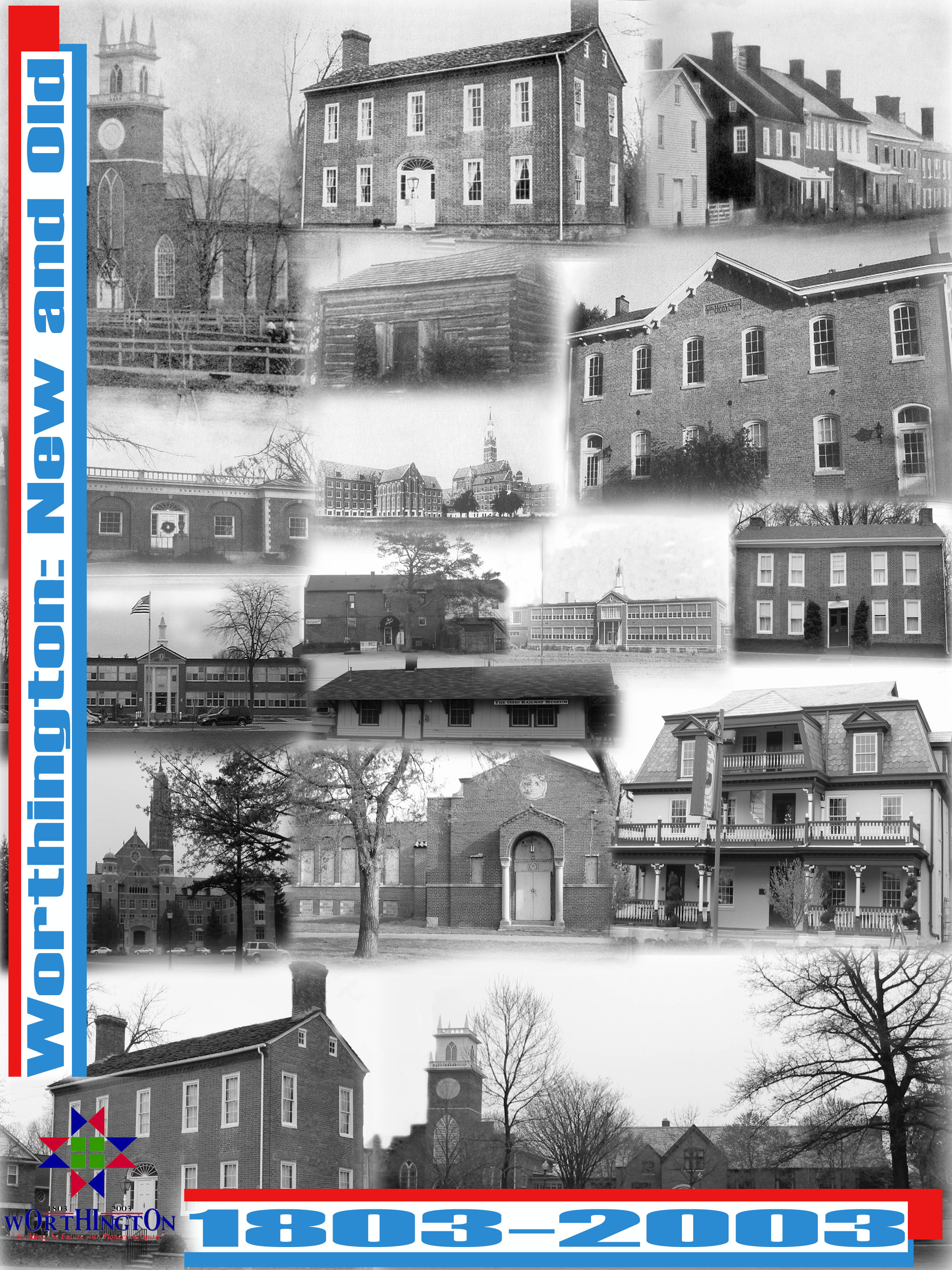 This graphic art montage was created by a student in the Advanced MultiMedia class at Thomas Worthington High School. The class created montages of historic and contemporary images for a Worthington Bicentennial school project. Students created one composite image from many individual images. Using Adobe PhotoShop graphic design software, they developed advanced graphic design and multimedia skills and techniques. The montages, measuring at least 18 x 24 inches were printed and mounted.