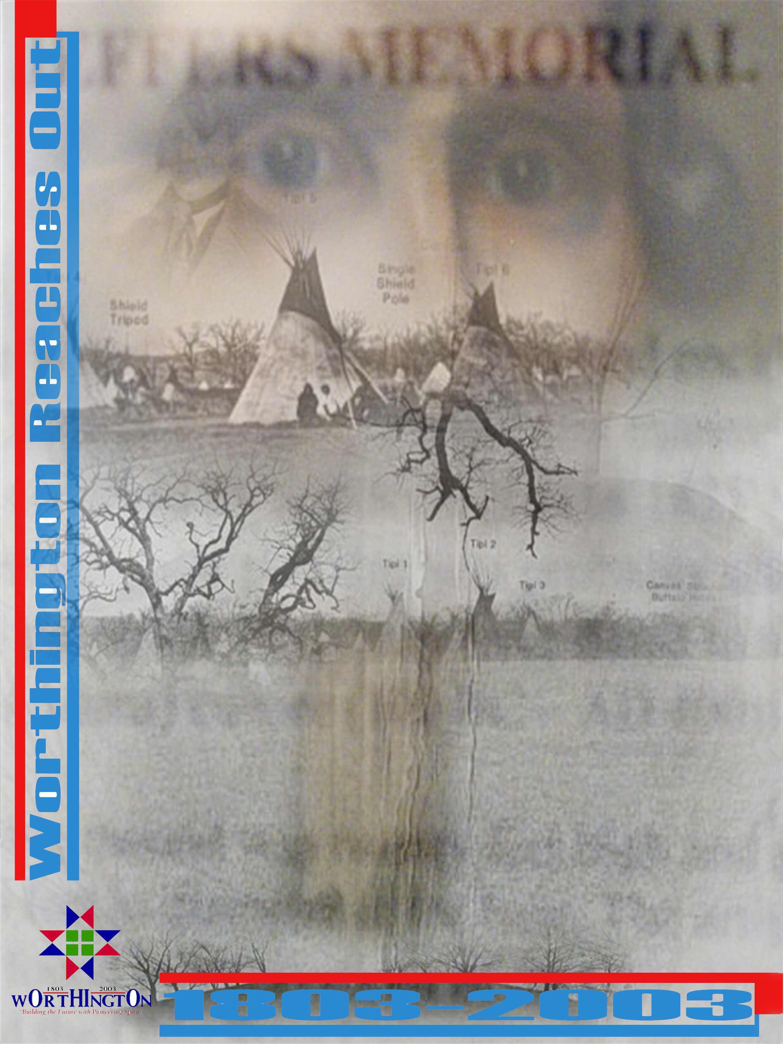This graphic art montage was created by a student in the Advanced MultiMedia class at Thomas Worthington High School. The class created montages of historic and contemporary images for a Worthington Bicentennial school project. Students created one composite image from many individual images. Using Adobe PhotoShop graphic design software, they developed advanced graphic design and multimedia skills and techniques. The montages, measuring at least 18 x 24 inches were printed and mounted.