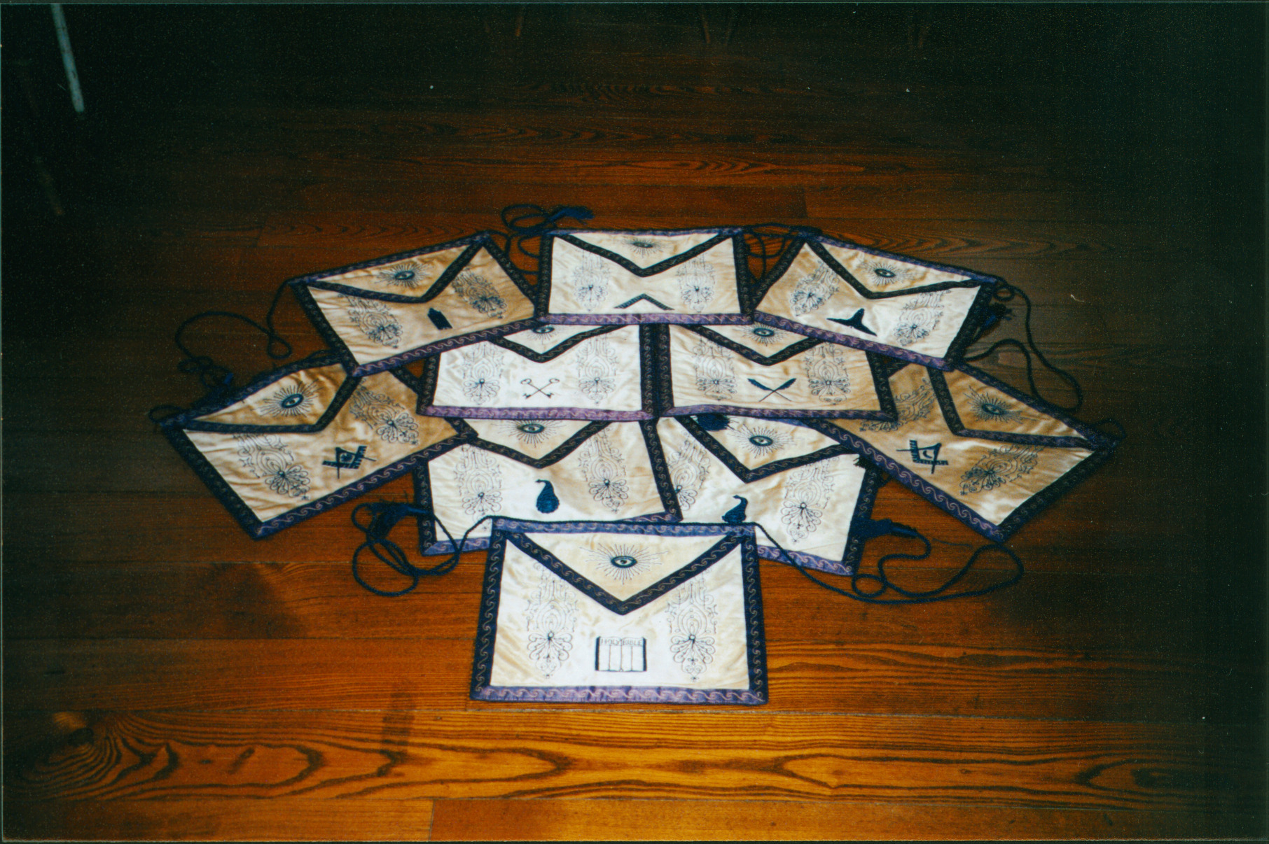 This is a set of officers' aprons from New England Lodge No. 4. The aprons serve a symbolic purpose, providing a visual tie to Masonic ancestors. Each apron has a specific symbol that relates to each office (Worshipful Master, Senior Warden, Junior Warden, Senior Deacon, Junior Steward, Senior Steward, Secretary, Treasurer, Chaplin, Tyler, and Musician).