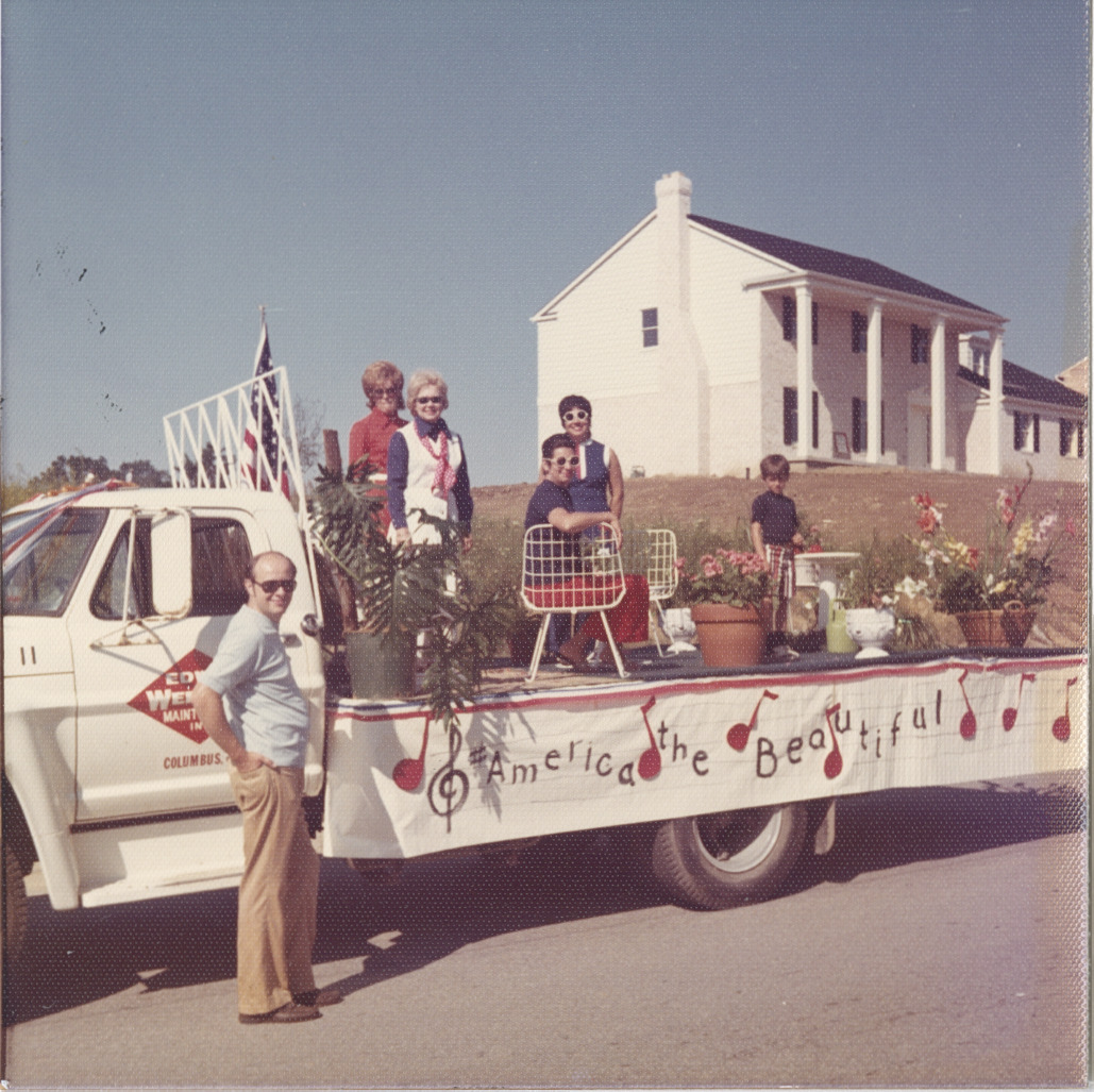 This color photograph shows six unidentified people with the Worthington Hills Garden Club float in the Worthington Hills neighborhood's first Fourth of July parade, 1973. A person stands by the driver's door of the flatbed truck the parade float is staged upon, with four adults and a child standing and seated on the float. Written on the side of the float is "America the Beautiful" with musical notes, and situated on the float are chairs and flower arrangements. In the background a home is visible; its address is unidentified.