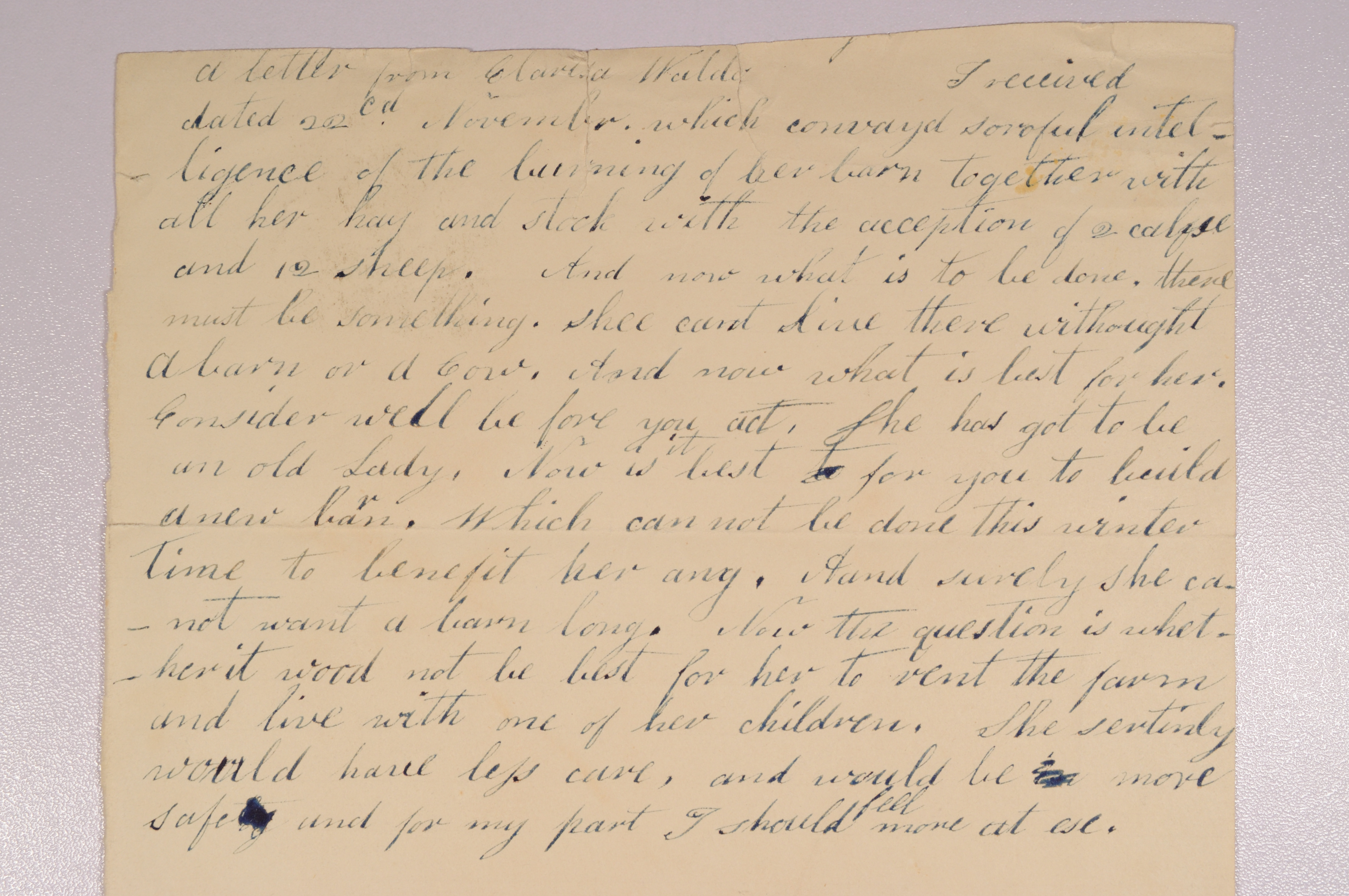 This partial letter is from an unknown writer written to an unknown recipient. It discusses the troubles that have befallen Clarissa Waldo, sister of Orange Johnson, and how she will be able to go on given her age and her circumstances. According to the letter, Clarissa's barn burned to the ground destroying her hay and killing most of her animals. The writer worries that with it being winter, Clarissa will not survive without a barn and animals. Because it would take too long to rebuild the barn in the winter, the writer goes on to suggest that it may be best for Clarissa to rent out her farm and go live with one of her children.
