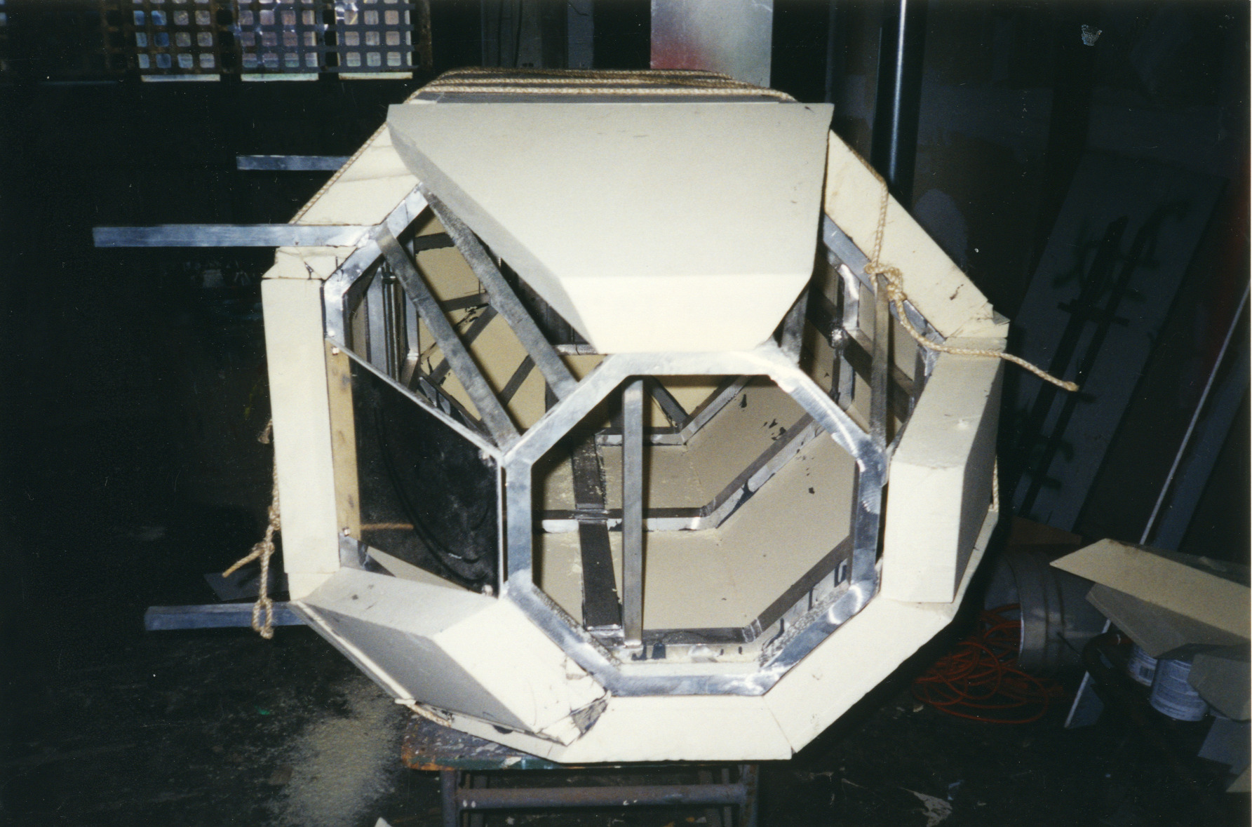 This is one of a series of photographs documenting the construction of the pig statue that would later be displayed in front of the Pig Iron BBQ, 5295 North High Street. The photographs were taken in the garage studio at 180 West South Street of the statue's creator, William (bc) (Bill) Collins. Shown here is the partially covered metal frame for the statue, which was built by Fortin. The frame would be covered in high-density urethane and carved and painted by bc, with LED lights added for the eyes.