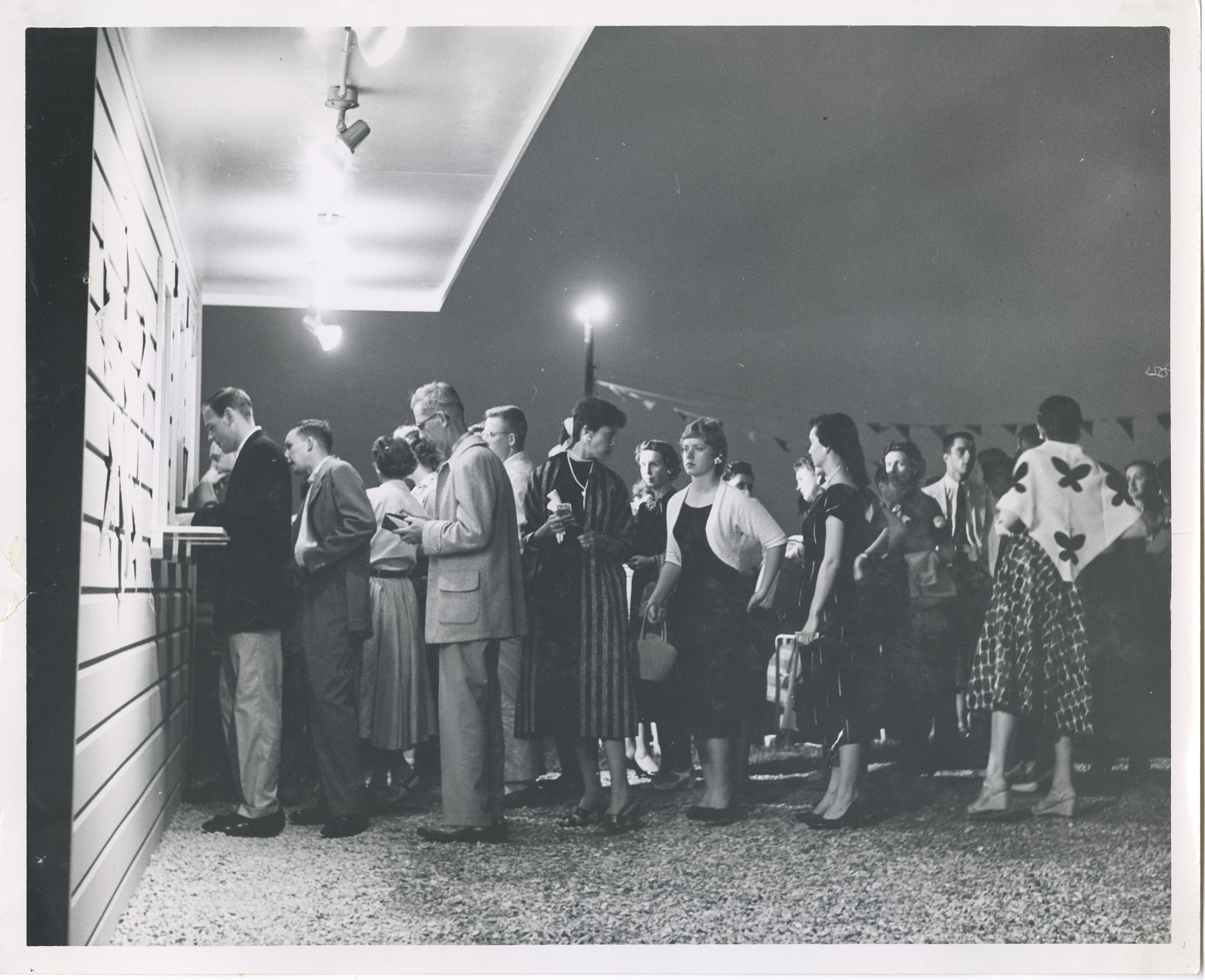 This undated, black-and-white photograph shows a line of people waiting at the box office for Playhouse on the Green (POG) at dusk. The photo was likely taken circa 1955-57. Floodlights light up the box office area, and pennant flags hang in the background.